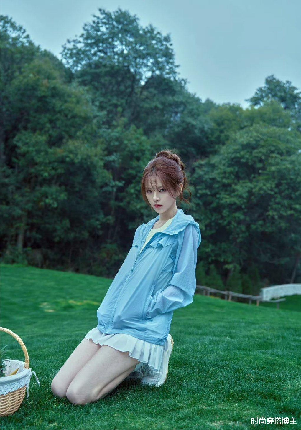 因为,这套穿搭真的太适合春天不知道穿什么的美少女们了,在一片绿意盎然的大自然中,万物复苏的绿色本就是很醒目的,可杨超越却很聪明,蓝绿色的外套清爽又提气色,比纯黑或者藏青色多了分春天的鲜活,再加上oversize的版型松松垮垮地挂在身上,不会给人一种用力过猛的感觉,美得很松弛。