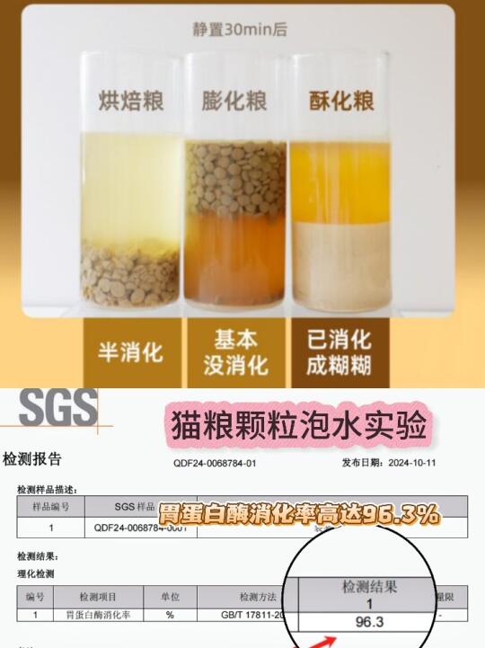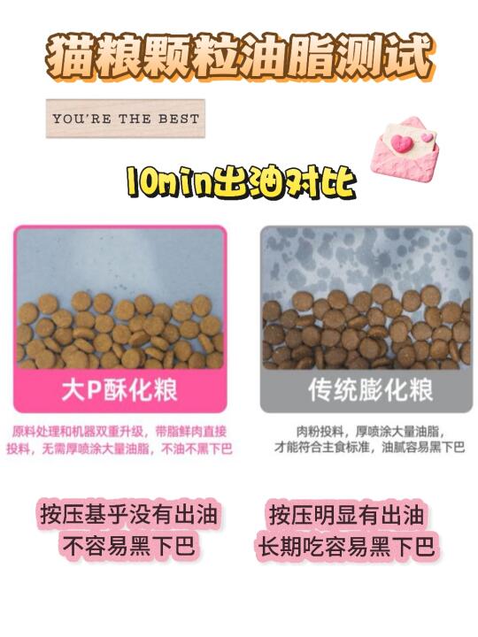 💡 猫粮工艺大揭秘!膨化vs酥化,谁更适合你家主子? 🔬 工艺对比 ✅ 膨化粮:高温高压成型,淀粉糊化度高,但可能营养流失,表面喷油易氧化 ✅ 酥化粮:低温冷压工艺,颗粒酥脆易消化,减少黑下巴风险,营养保留更完整 酶解工艺:30%高比例酶解鲜鸡肉,比鲜鸡肉贵2倍,大分子蛋白变成小分子蛋白,不用消化直接吸收。 酥化工艺+酶解工艺+单一低敏鸡肉+3种消化酶+5种肠胃卫士,共同构筑了肠道养护6边型的强大肠胃屏障,让胃蛋白酶消化率高达96.3%,动物真实实验表观消化率高达90.12%,肠胃粮表观消化率能达到90%的只有2-3家,大P酥化猫粮就是其中一家。 💧 溶解度测试(模拟猫咪胃液环境) ▪ 膨化粮:30分钟仍较硬,消化慢,肠胃弱猫咪易软便 ▪ 酥化粮:10分钟开始分解,20分钟完全溶散,对玻璃胃超友好! ⚡ 出油实验(吸油纸按压法) 膨化粮👉油印明显(易致黑下巴) 酥化粮👉几乎无油渗出(清爽不油腻) 🐈 喂养效果 📌 软便猫:换酥化粮后,便便成型度提升80%! 📌 黑下巴猫:2周后油脂粒减少 📌 挑食怪:酥脆口感+肉香保留度高,适口性完胜 🌟 选购Tips 1⃣ 看成分表前三位须是鲜肉(非肉粉) 2⃣ 选单一蛋白源(低敏配方) 3⃣ 添加复合消化酶对猫咪胃肠友好 我们家这次选的大P真的淘到宝了,通过了40➕项安全检测,批批检测甚至符合出口标准,爱吃的很,积极炫饭~肉眼可见的排便成型了。有玻璃胃困扰的猫真的快去试试~