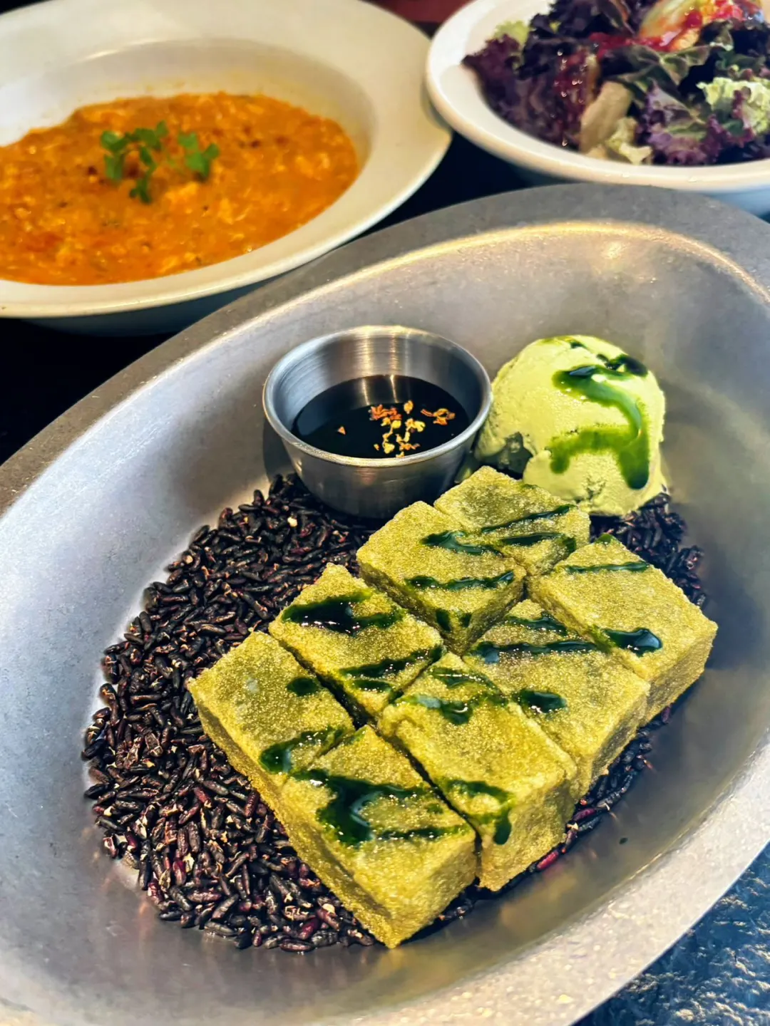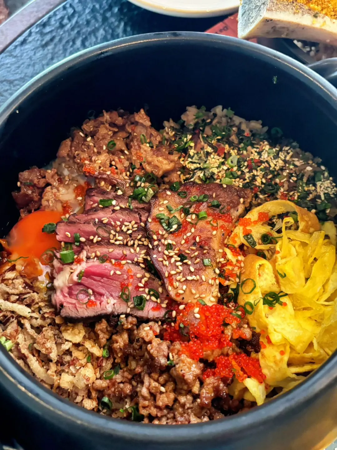 就在金陵中环 吃到了一家敲有氛围的日料店! 暗调的装修环境高级感满满! 直接锁死成为我的日料白月光✨!! 鹅肝和牛肉食者釜饭➕牛骨髓肉末菌菇拌饭 都好好吃哦🤤双倍碳水的快乐 真的很上头❗️ 蟹泥滑蛋佐黄油吐司 浓郁的蟹肉和滑蛋搭配焦脆的吐司搭 一口接着一口根本停不下来!香迷糊了! 还有黑米抹茶年糕冰淇淋🍦抹茶味jujuju浓郁!🥹🥹吼吼次啊