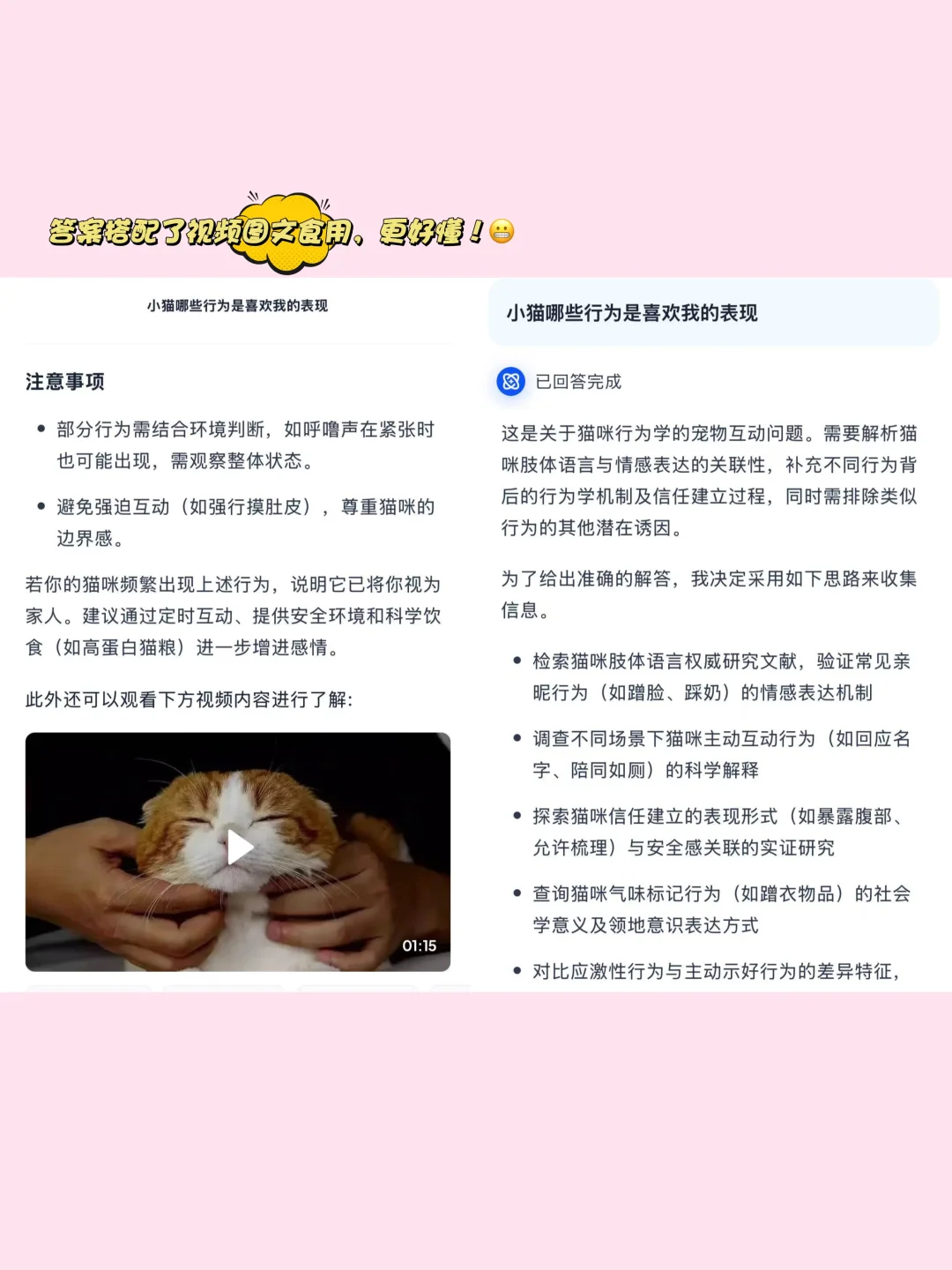 深度搜索一下,他总能很直击的告诉我重点,给我提供更精准方案,对小猫营养优化,科学护毛都能提供优质回答!
