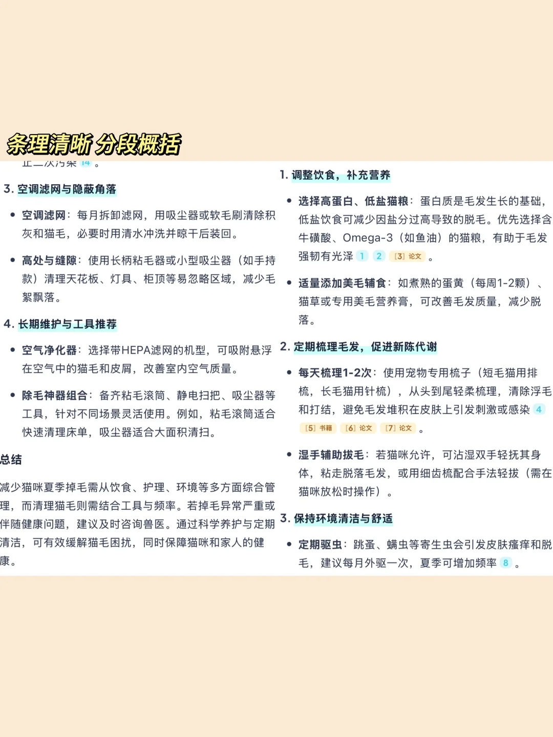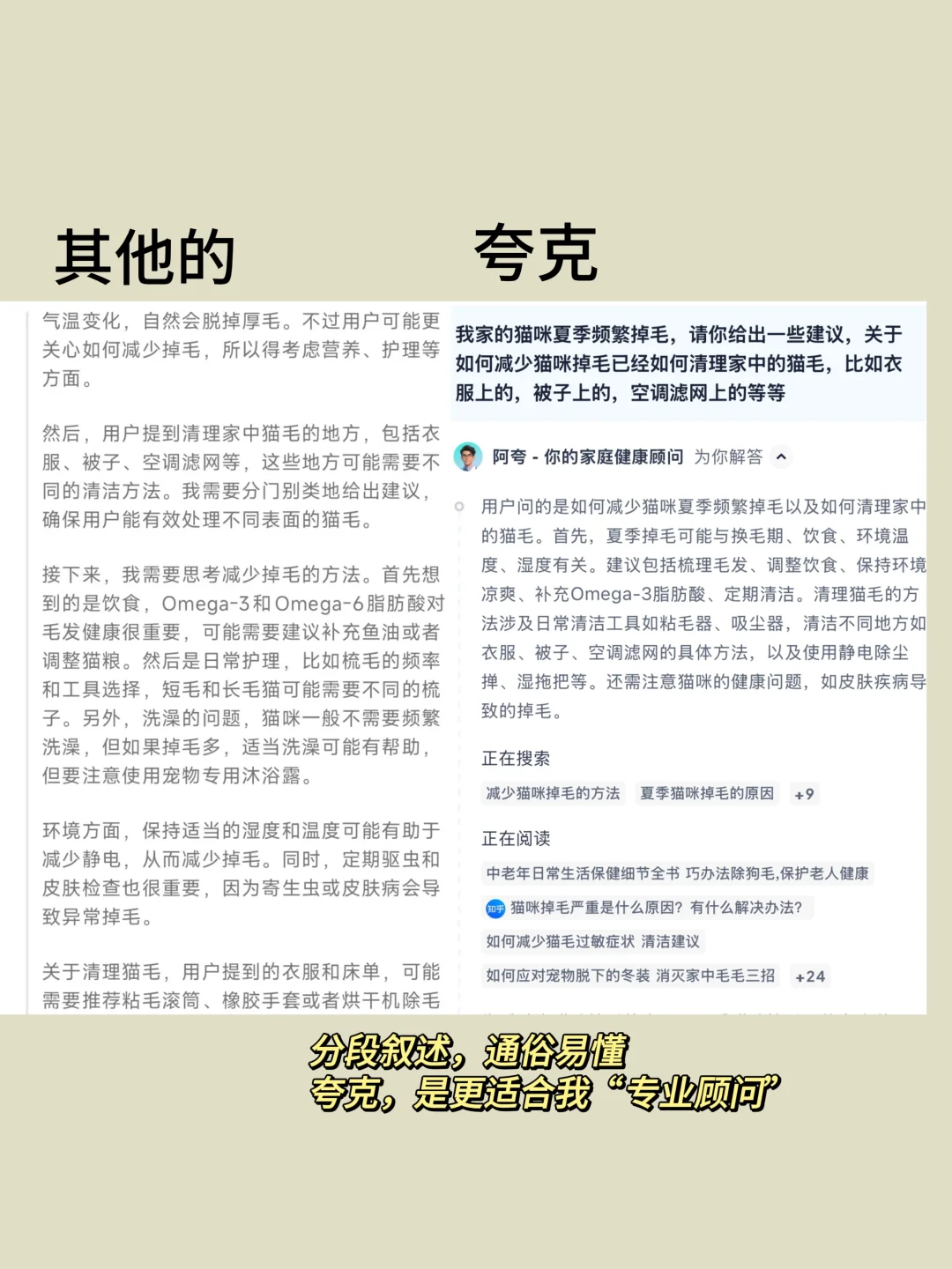 好啦,交给夸克,夸克懂~ 把他当成米米的资深宠物医生 我问了他 “宠物换季掉毛问题和清理猫毛问题”
