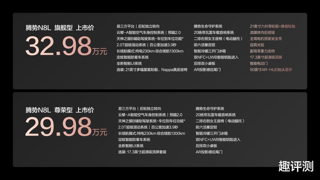 10月28日,“大六座安全豪华SUV”腾势N8L正式上市,共推出2款车型,官方指导价为29.98万元~32.98万元!N8L全系标配“六大核心科技”,以超越传统豪华的品质标准,诠释家用车的豪华感、安全感与科技感,创造让全家人动心、舒心、省心、安心、暖心的出行体验,以“五心体验 三感相伴”,定义美好出行。