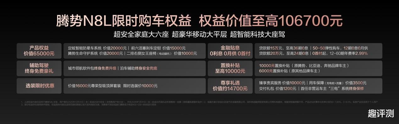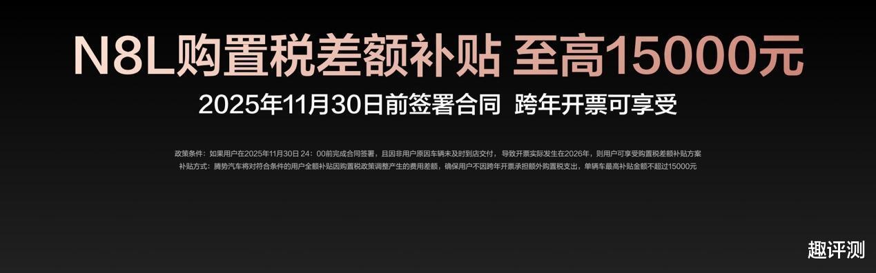 为回馈广大用户的支持与信赖,腾势N8L特别推出限时购车权益,权益价值至高10.67万元!包括价值1.7万元的三年免息,最高1万元的置换补贴。此外,不必担心因为交车晚,享受不到购置税补贴:在2025年11月30日24点前完成合同签署的用户,如果因非用户原因车辆未及时交付,导致开票实际发生在2026年,可享受购置税差额补贴,最高1.5万元!