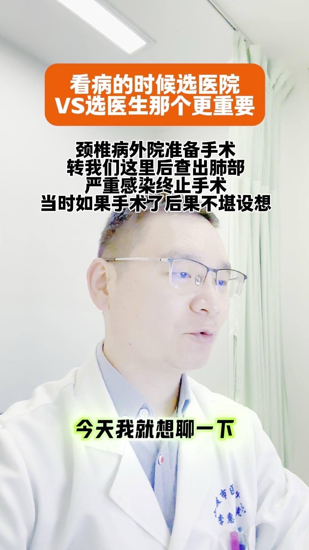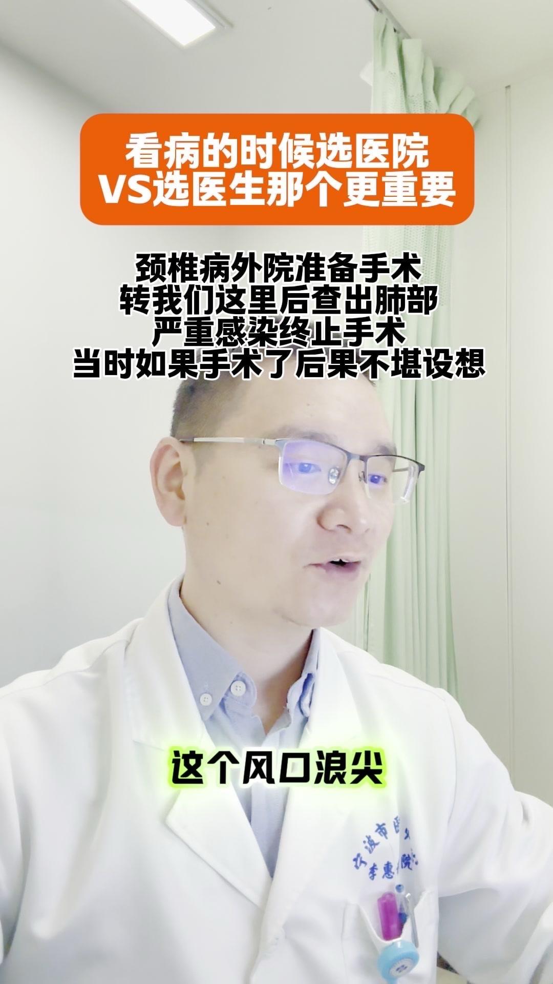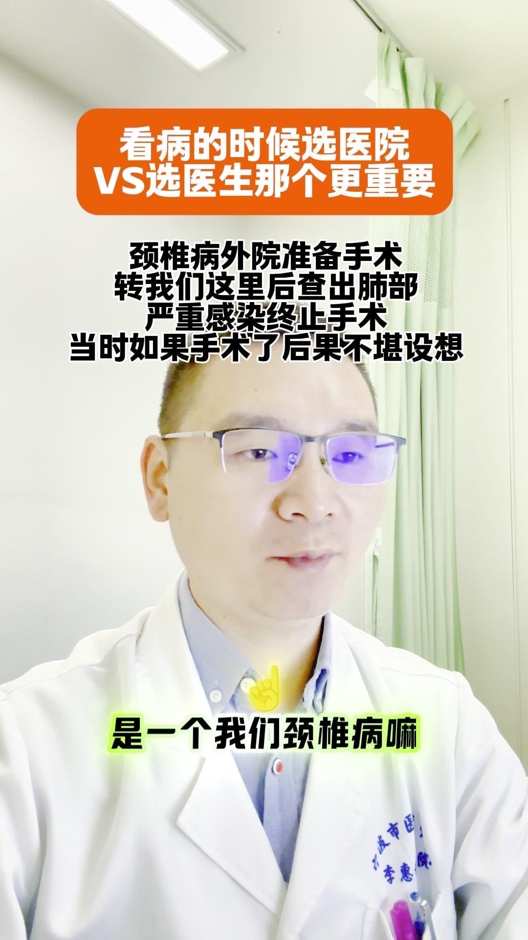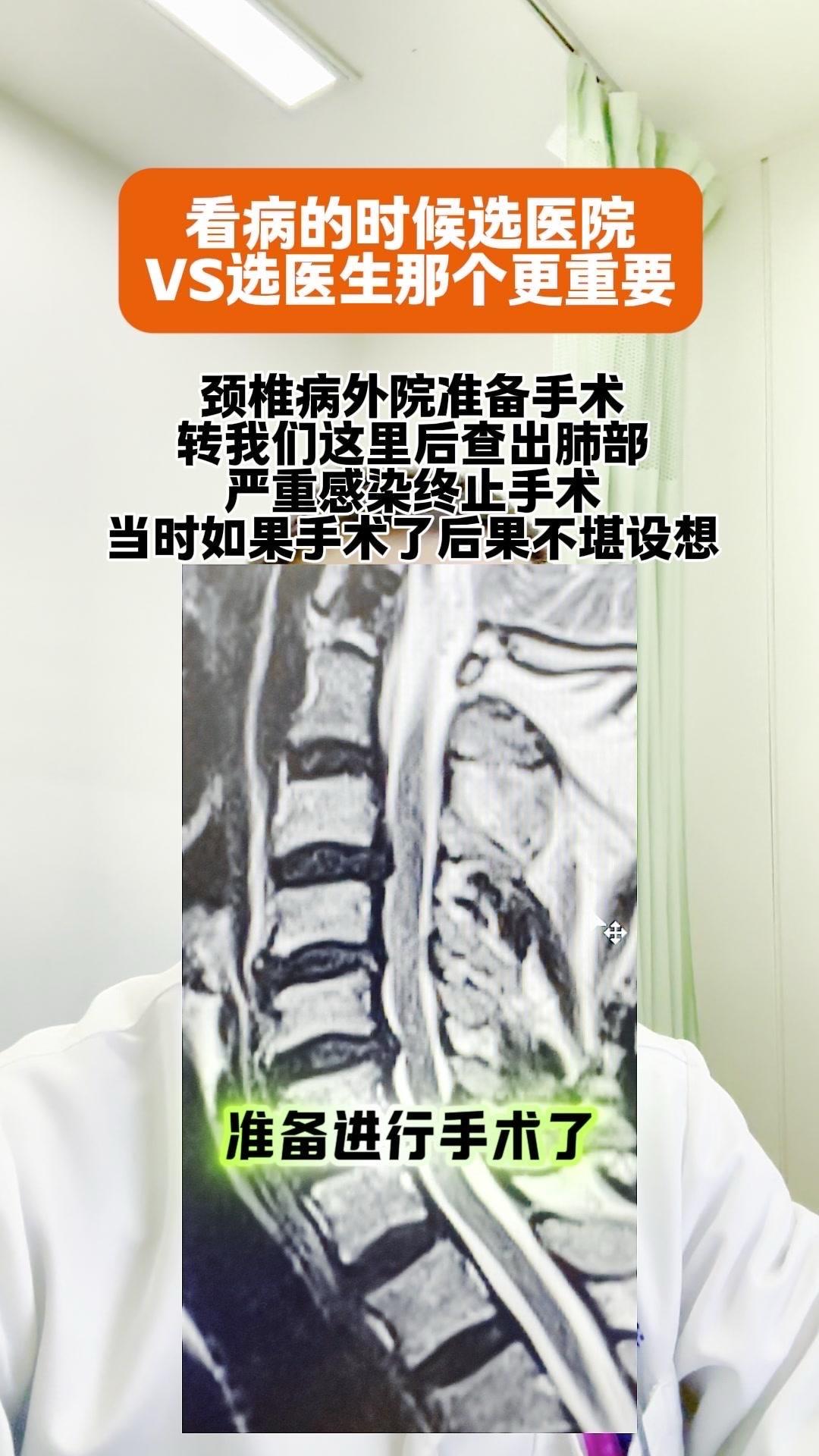 看病时选医生还是选医院更重要?🤔最后的这个4+4的这个事件,会把医生和医院这个风口那里,那这个事件本身,我们现在也不需要做过多的评论。 今天我就想聊一下,就是我们看病时选医院选医生的问题。 🤔观念: 很多人在看病时,就会先设定一个条件,我们去某某医院,然后再选择某某医生。 🤔去好的医院的概率: 这个其实大家心里自己有数,当然去好的医院,就是大家认为好的医院,可能这种遇到好的医生概率大,但是这个不是100%的。 🤔分享一个很简单的病例: 这个病人来时是一个颈椎病的设计,他本来原先啊是到我们一个所