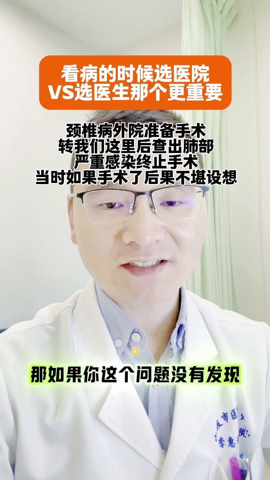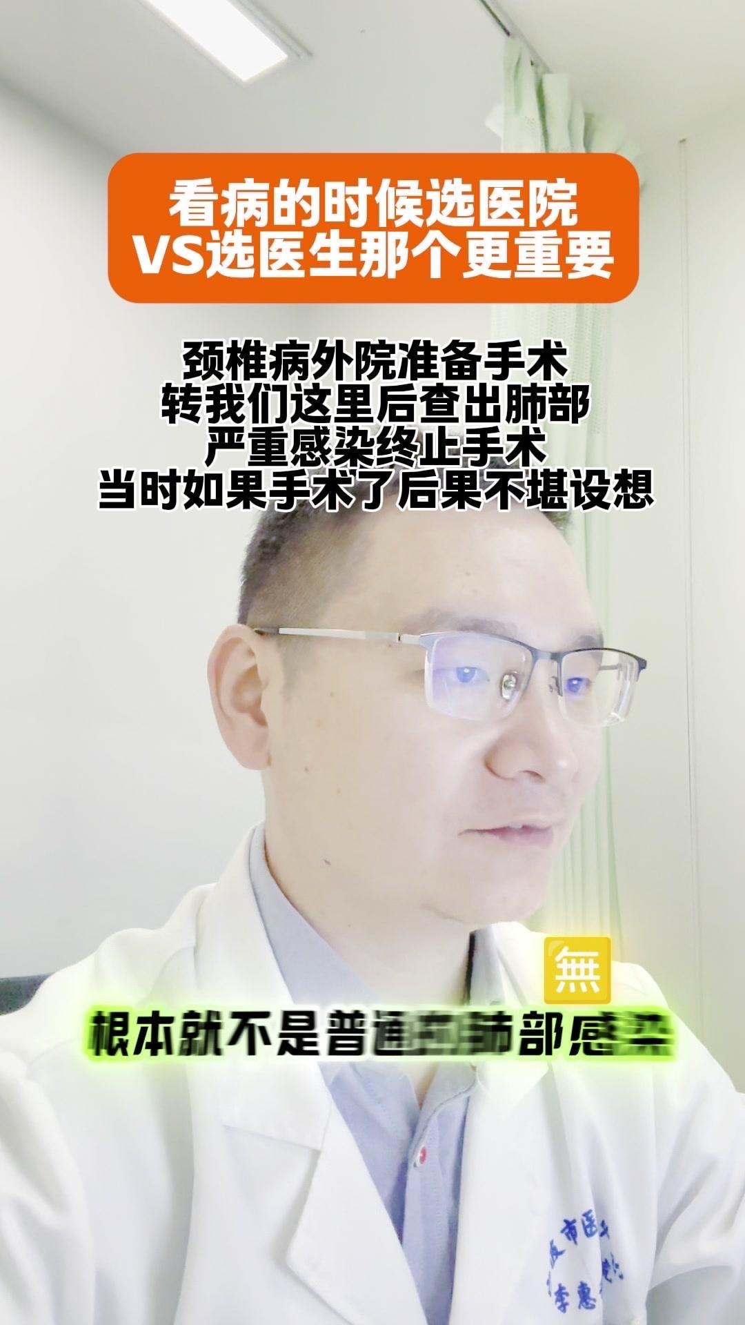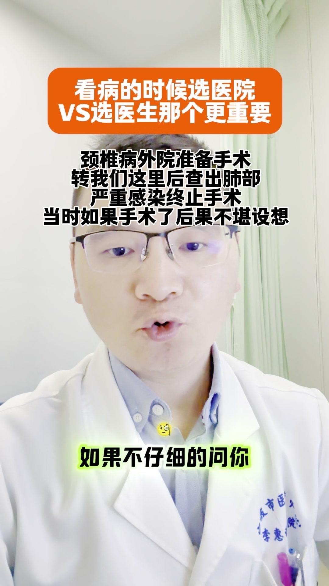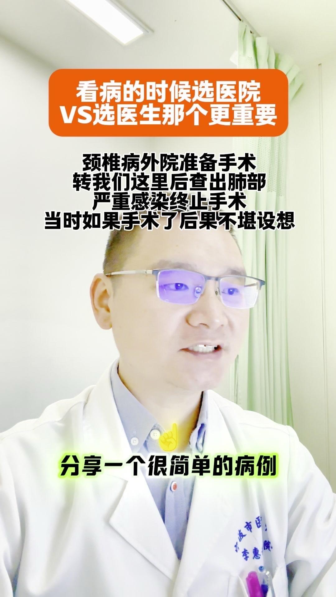 看病时选医生还是选医院更重要?🤔最后的这个4+4的这个事件,会把医生和医院这个风口那里,那这个事件本身,我们现在也不需要做过多的评论。 今天我就想聊一下,就是我们看病时选医院选医生的问题。 🤔观念: 很多人在看病时,就会先设定一个条件,我们去某某医院,然后再选择某某医生。 🤔去好的医院的概率: 这个其实大家心里自己有数,当然去好的医院,就是大家认为好的医院,可能这种遇到好的医生概率大,但是这个不是100%的。 🤔分享一个很简单的病例: 这个病人来时是一个颈椎病的设计,他本来原先啊是到我们一个所