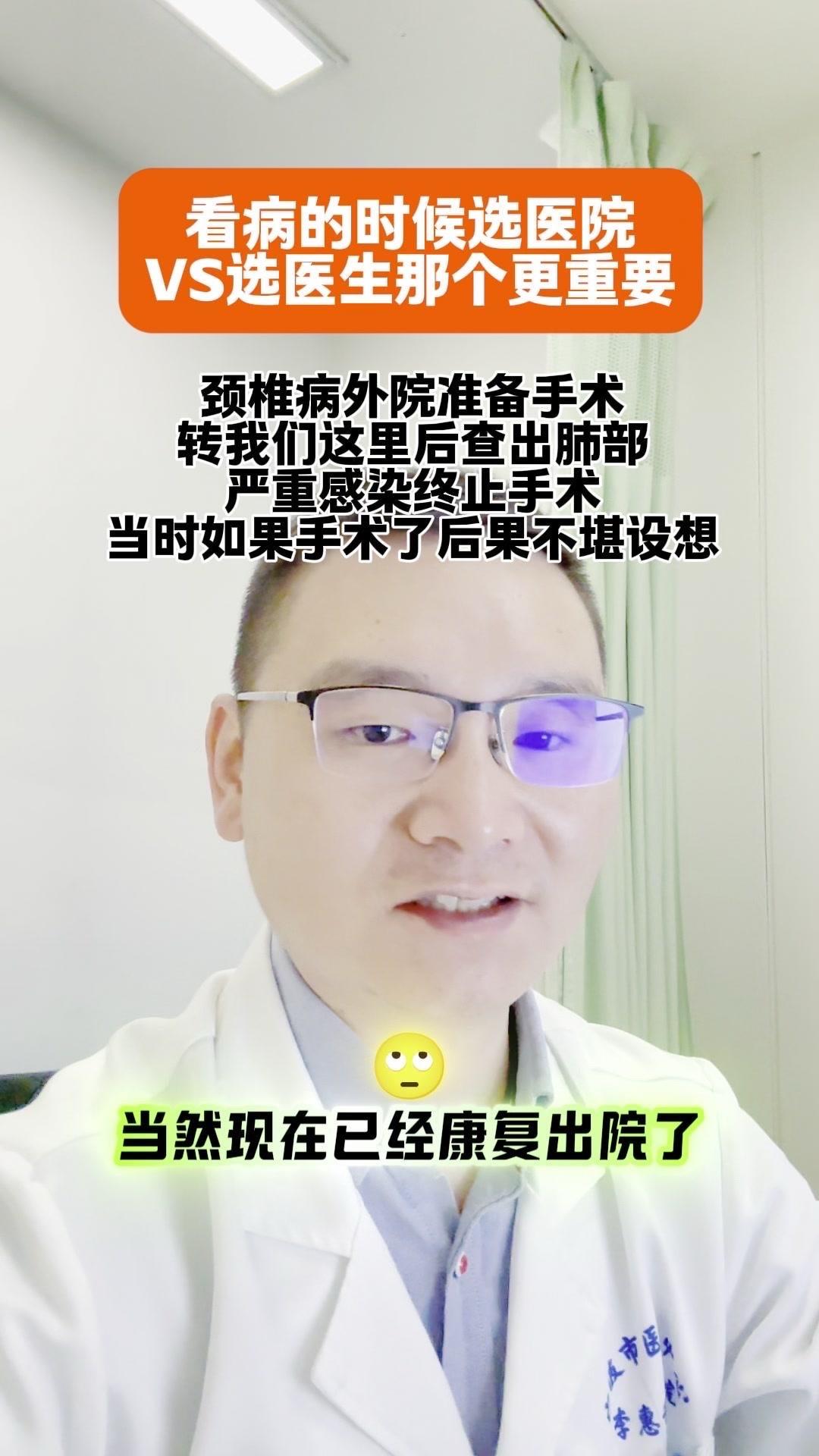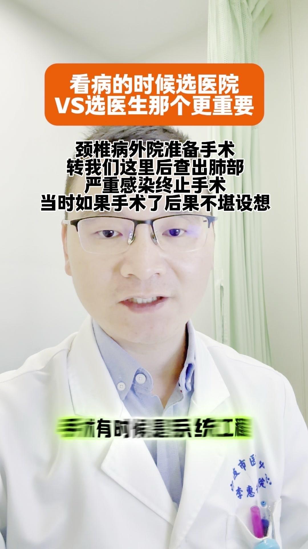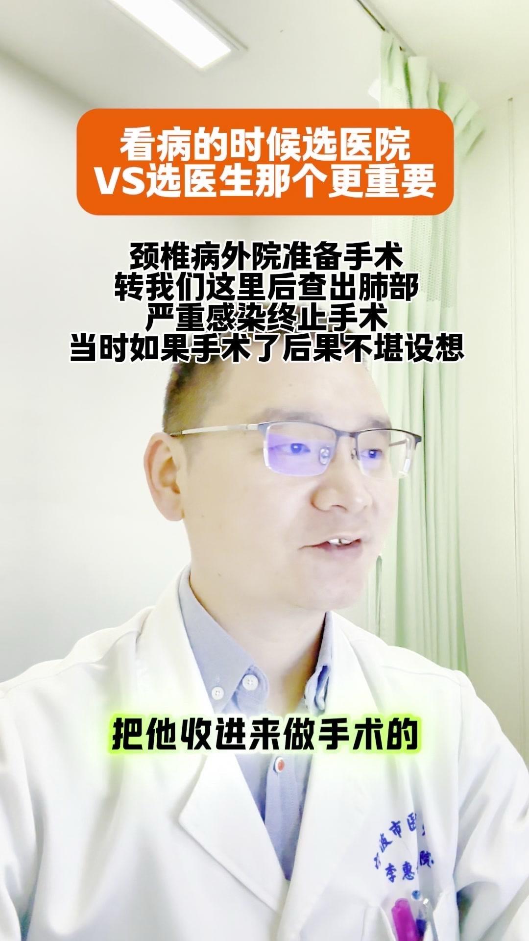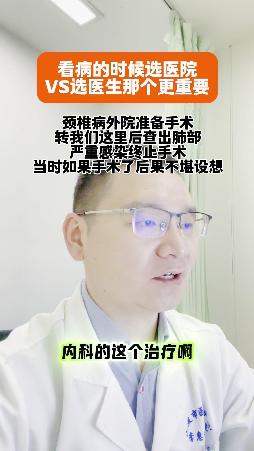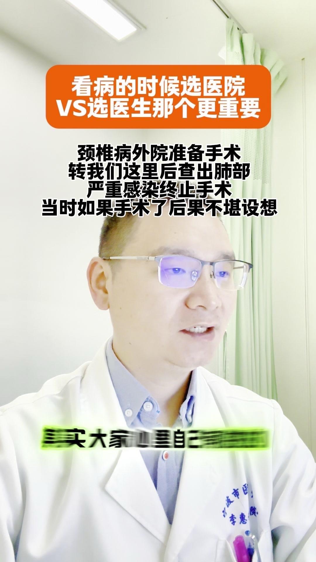 看病时选医生还是选医院更重要?🤔最后的这个4+4的这个事件,会把医生和医院这个风口那里,那这个事件本身,我们现在也不需要做过多的评论。 今天我就想聊一下,就是我们看病时选医院选医生的问题。 🤔观念: 很多人在看病时,就会先设定一个条件,我们去某某医院,然后再选择某某医生。 🤔去好的医院的概率: 这个其实大家心里自己有数,当然去好的医院,就是大家认为好的医院,可能这种遇到好的医生概率大,但是这个不是100%的。 🤔分享一个很简单的病例: 这个病人来时是一个颈椎病的设计,他本来原先啊是到我们一个所