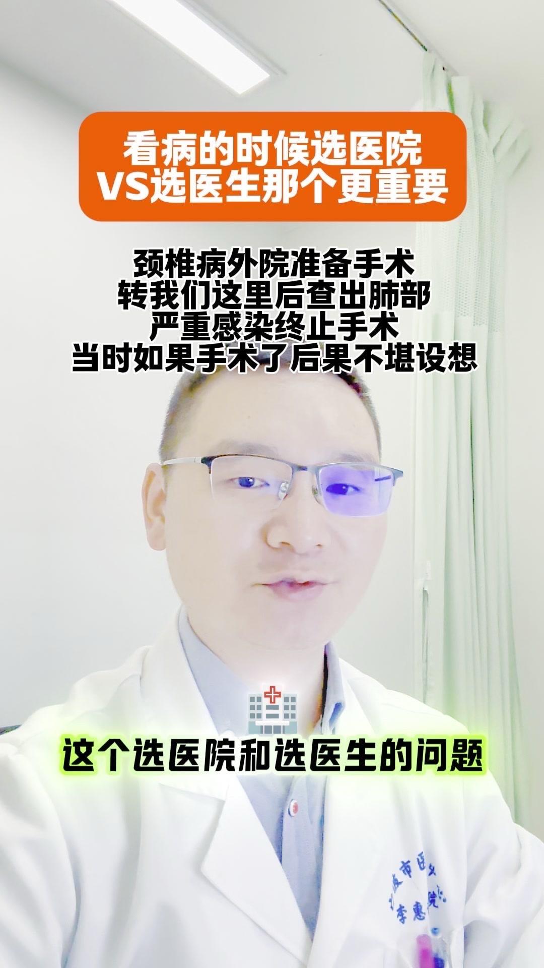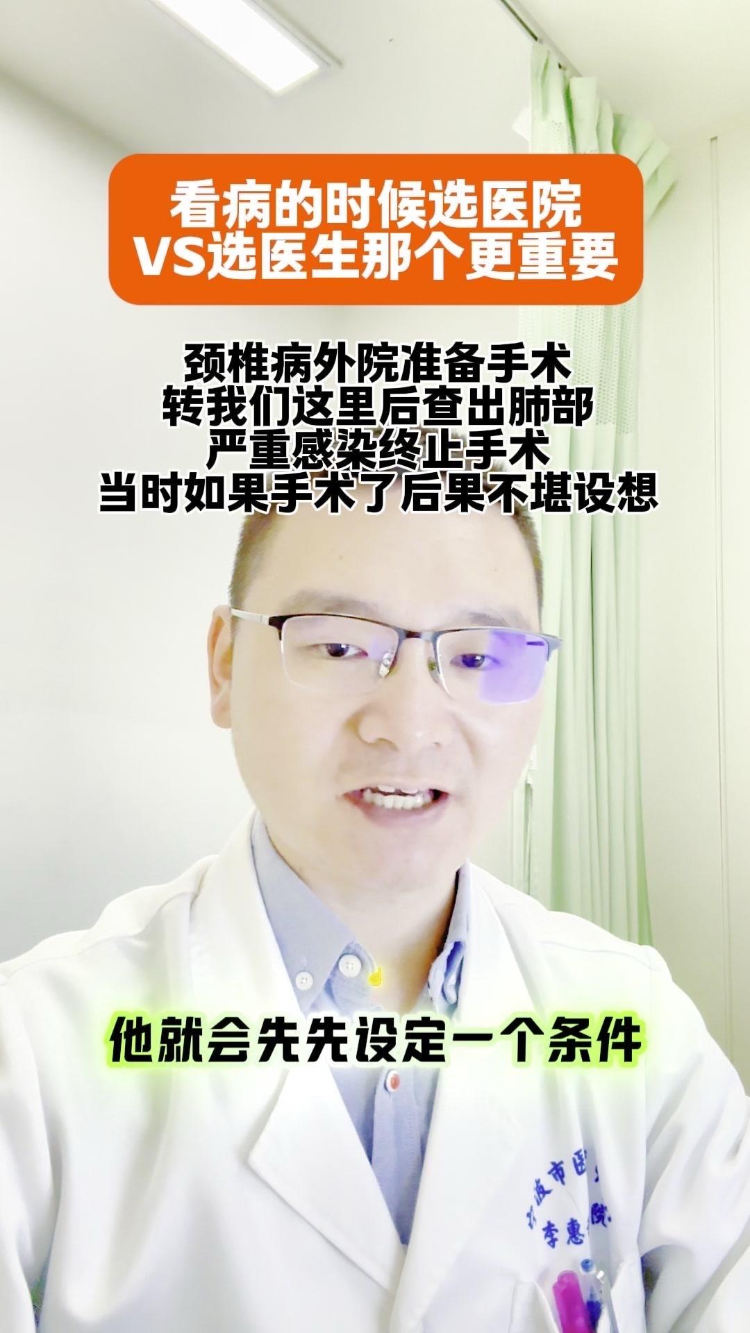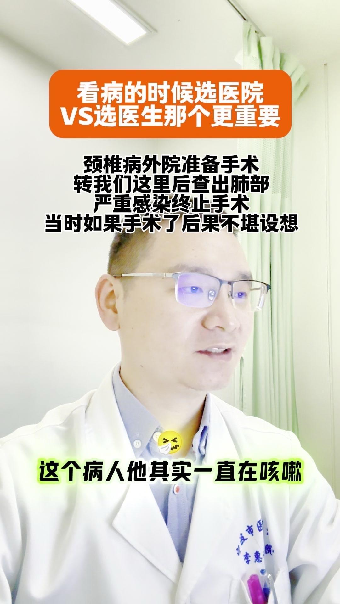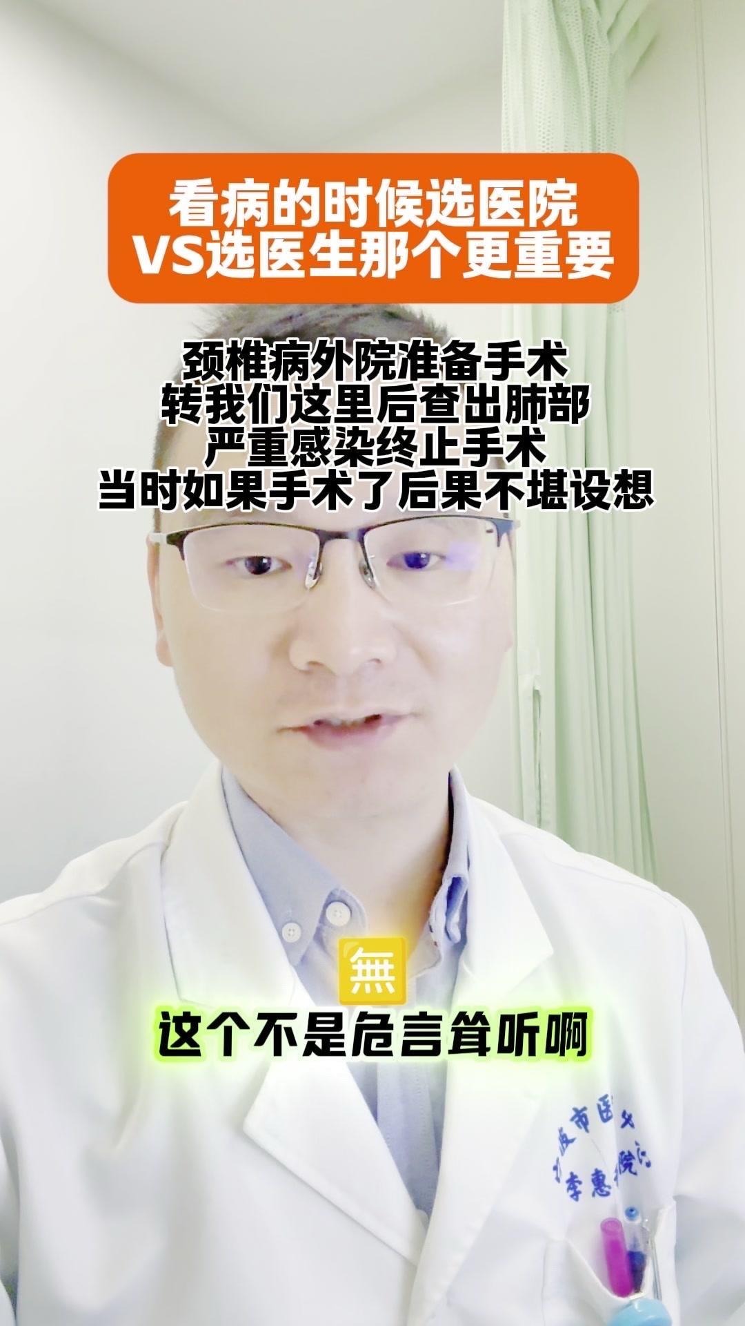 看病时选医生还是选医院更重要?🤔最后的这个4+4的这个事件,会把医生和医院这个风口那里,那这个事件本身,我们现在也不需要做过多的评论。 今天我就想聊一下,就是我们看病时选医院选医生的问题。 🤔观念: 很多人在看病时,就会先设定一个条件,我们去某某医院,然后再选择某某医生。 🤔去好的医院的概率: 这个其实大家心里自己有数,当然去好的医院,就是大家认为好的医院,可能这种遇到好的医生概率大,但是这个不是100%的。 🤔分享一个很简单的病例: 这个病人来时是一个颈椎病的设计,他本来原先啊是到我们一个所