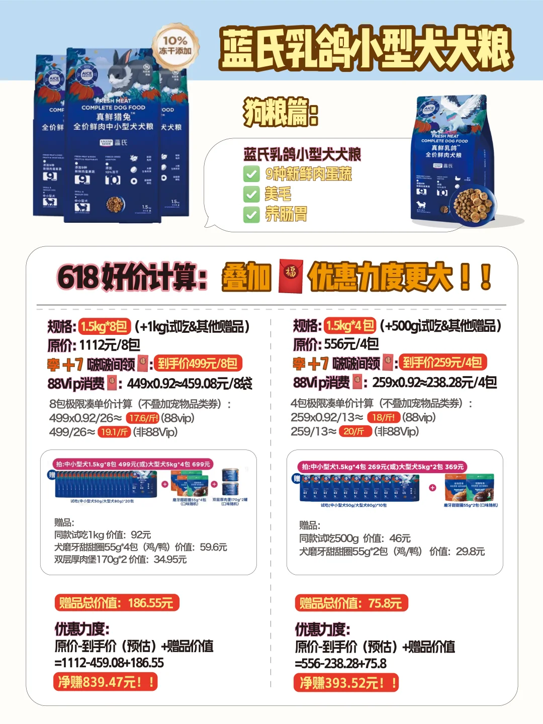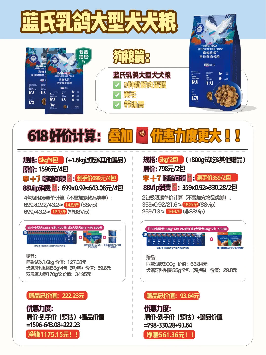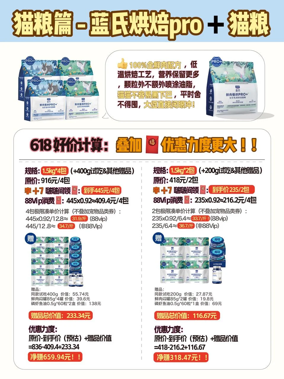 6·18蓝氏猫粮/狗粮好价攻略!看到就是赚到!(附详细时间表!⏰) 一、猫粮篇: ⭐蓝氏乳鸽猫粮 👍🏻老牌国货,经典乳鸽款,大促必囤~ +7啵啵间领⭕:549元/8包,289/4包 ⭐蓝氏烘焙Pro➕猫粮 👍🏻100%全鲜肉,低温烘焙,平时舍不得囤,大促直接闭眼冲! +7啵啵间领⭕:445元/4包,235/2包 二、猫罐头&猫条&猫饭篇: ⭐蓝氏cute罐成猫/幼猫 👍🏻适合小鸟胃,一餐一罐,适口性很好。 +7啵啵间领⭕:105r/24罐 ⭐蓝氏主食猫条 👍🏻高肉高蛋白,主食级营养。猫咪超爱 +7啵啵间领⭕:105r/84支 ⭐蓝氏主食猫饭 👍🏻“蒸”鲜猫饭,主食级营养。含肉量很高 +7啵啵间领⭕:129r/30包 三、狗粮篇: ⭐蓝氏乳鸽小型犬犬粮 👍🏻9种新鲜肉蛋蔬,美毛,养肠胃 +7啵啵间领⭕:499元/8包,259元/4包 ⭐蓝氏乳鸽大型犬犬粮 👍🏻9种新鲜肉蛋蔬,美毛,养肠胃 +7啵啵间领⭕:699元/4包,359/2包 叠加88VIP,啵啵间🧧优惠🍐度更大! 具体凑单步骤参考📒哦! 618李佳琦李佳琦直播间618攻略618大促养猫用品推荐新手养猫宠物用品蓝氏蓝氏乳鸽猫粮狗粮养狗养宠宠物节