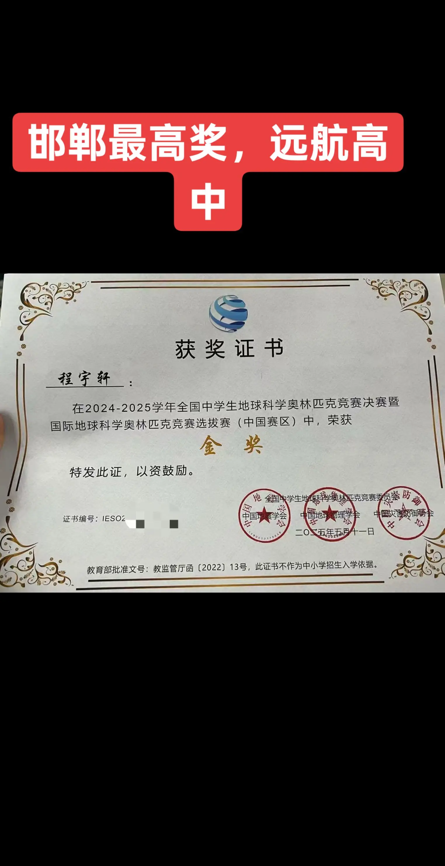 邯郸骄傲,河北唯二全国地理竞赛金牌,一枚在远航,一枚在衡水。远航学子程宇轩获得2025年全国地理竞赛金牌。祝贺远航高中,全国金奖远航学子,邯郸人的骄傲,地理金奖