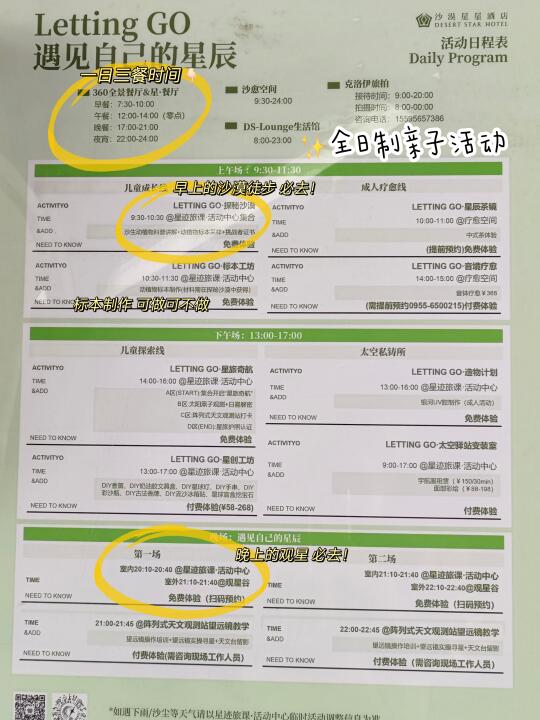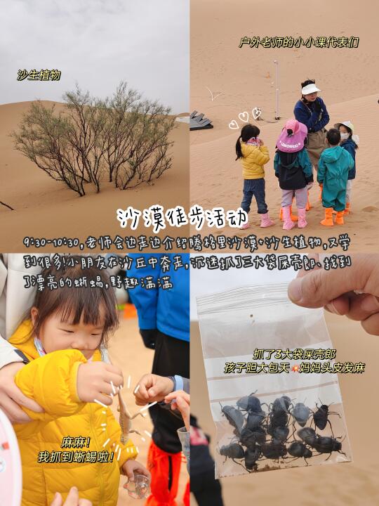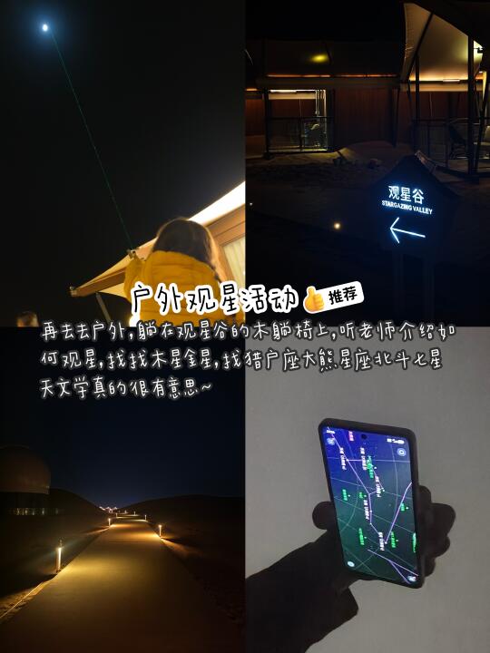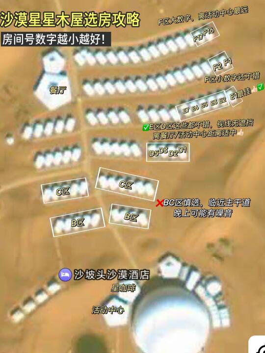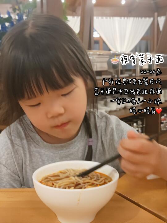 5/6入住沙漠星星1晚,体验超棒,不愧是国内亲子酒店天花板,沙漠徒步、室外观星,一家三口吃好玩好,孩子直呼不想回家,很值得!热乎乎的攻略奉上 - 📍酒店:中卫沙坡头沙漠星星酒店 🏨房型:木屋双床房1晚,床是榻榻米,双床可以2张床拼一起,一家三口无压力 💰房费:去哪儿预定,2635,含自助早餐+自助晚餐+夜宵 - ⭐️特色亮点 ▫️国内唯一沙漠观星主题酒店 ▫️推开门就能玩沙,酒店自带超多挖沙玩具,小朋友的天堂 ▫️全日制亲子活动+专业天文课程 ▫️戴森吹风机,欧舒丹全套洗护,百岁山无限供应 ▫️minibar丰富,果汁饮料、坚果、饼干、黄桃干、水果 ▫️5A景区沙坡头免费直通 - 🏡木屋房怎么选 为啥要选房,第一是视线无遮挡!第二是选能避开人流+私密性好的 👍🏻最佳:E1,视线无遮挡,安静又便利的黄金位置 👍🏻次优:E2-E7、D1-D5、F17-F16,视线无遮挡,去餐厅+活动中心距离都合适 👍🏻次次优:F1-F2,安静视野好,距离最远 ⚠️ 慎选,BC区临近主干道,晚上有噪音 ⚠️ 早上8点电话联系酒店,报预订人姓名能提前留房 E1抢手,我们8点20打过去只有E5了,也很不错,视线无遮挡 - 🟡酒店玩玩玩 全天都有活动,推荐2个最值得去的 ✨观星活动:每晚2场,我们去的第二场21:10-22:40,先室内学知识,再去户外实战看星星,了解从古至今各种观星方式,大人孩子听得都很认真,再去观星谷户外看星星,找木星金星,找猎户座北斗七星,天文学真有意思 ✨沙漠徒步:9:30-10:30,老师会边走边介绍腾格里沙漠+沙生植物,学到很多!孩子在沙丘中奔走,沉迷抓屎壳郎、找到了蜥蜴🦎,野趣满满 - 🍚木屋餐厅吃吃吃 🍲晚餐:17-21点自助小火锅,现切滩羊肉无限续加,还有牛肉卷、大虾、蔬菜豆制品、酸奶蛋糕水果各种,推荐尝尝西夏啤酒 🍜夜宵:22-24点,蒿子面是当地特色,晚上来一碗暖心暖胃 🍽早餐:7点半-10点,自助早餐很丰富,强烈推荐藜麦枸杞粥,超好喝 - 🎒建议自备 ▪️激光指星笔:观星课互动 ▪️防沙鞋套:沙漠徒步要用 ▪️护目镜:风大沙子糊眼睛不舒服,滑沙必备一定要买 ▪️防沙面罩:酒店会送,提前买了挂耳的,好看+不容易掉 - ❤️酒店邻居都是小朋友,门口挖沙自来熟,孩子睡醒了挖挖挖,晚上倒头就睡,体验感超棒 ❤️下篇发银川中卫5日自驾游攻略