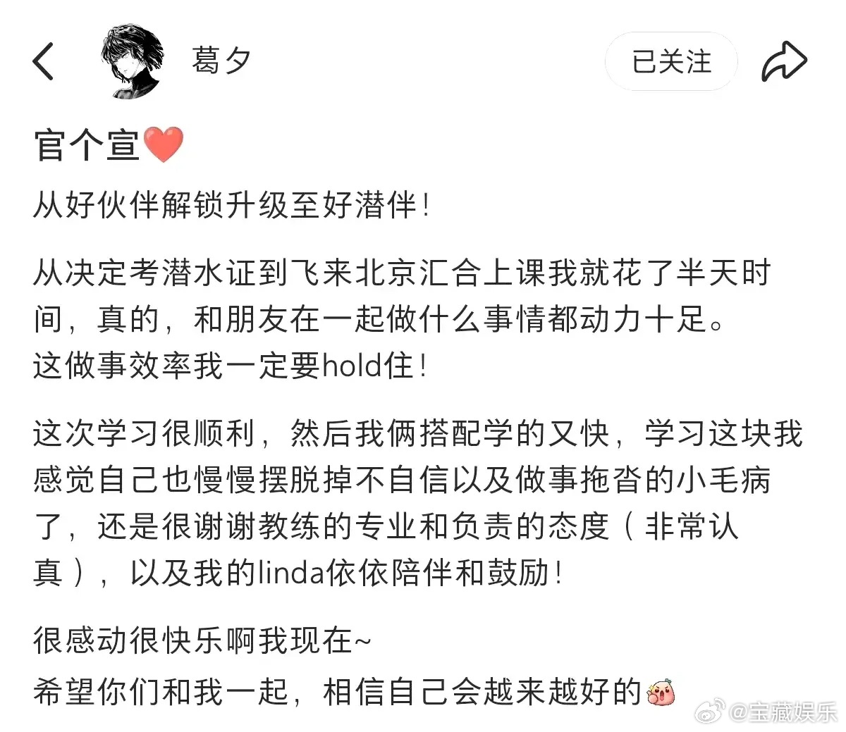 黄圣依葛夕的关系已经发展成了好朋友,两人甚至还一起报名考取了潜水证书。对此,有网友幽默地调侃说,再见爱人变换乘恋爱[允悲][允悲]