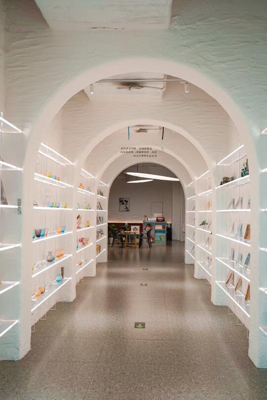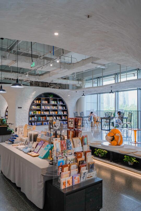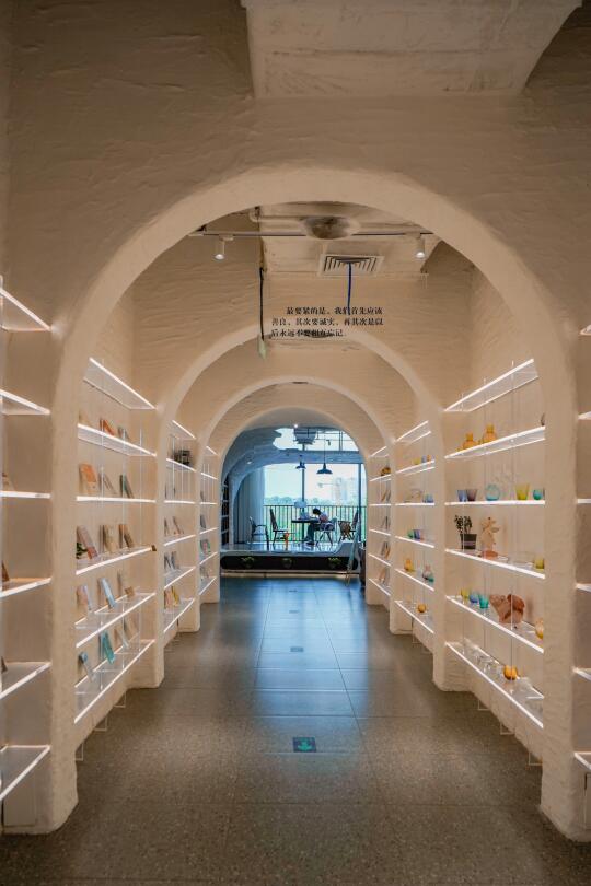 书店装饰颇有洞穴风、纯米色背景墙、城堡式拱形门。店内空间宽阔,既能在充满绿意的落地窗前看书,又可以在较为隐私的「洞穴」内自习。