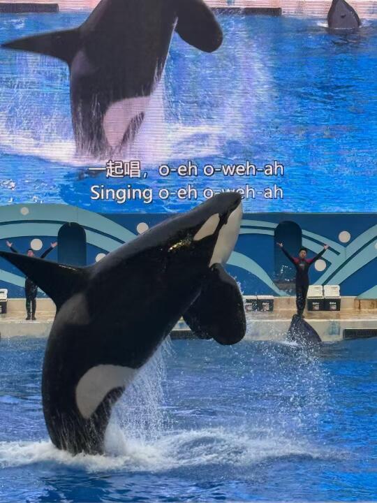 ✅虎鲸传奇🐳在虎鲸剧场 ,五只虎鲸一起跃出水面,冲滩炸水超震撼,演出时间 11:30 ,记得提前去占座