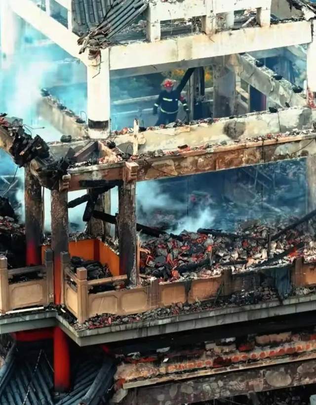 直到上世纪90年代,才以混凝土框架搭配木饰的方式重现风貌。而这场大火,意外地揭开了它“现代结构”的里子,也点燃了公众对“何为古建筑”的广泛争议。