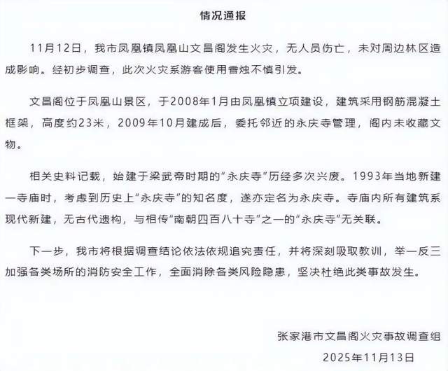 近日,江苏张家港凤凰山的永庆寺文昌阁在一场火灾中损毁严重,只剩下光秃秃的钢筋混凝土骨架。