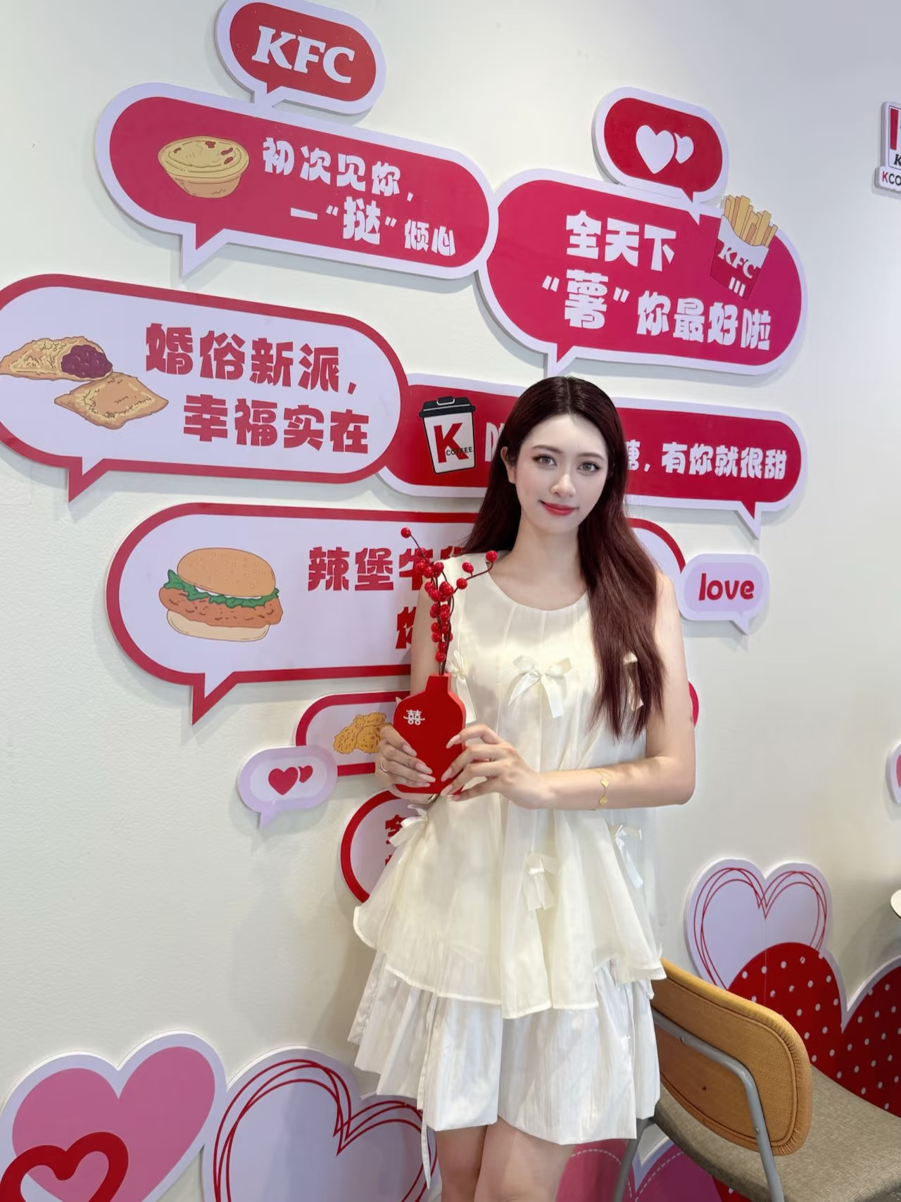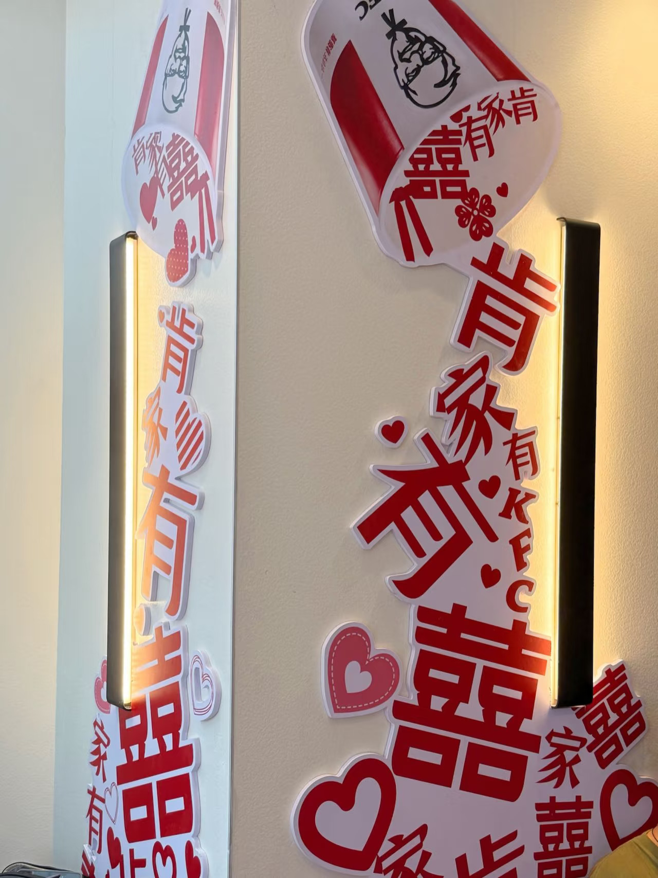 在肯德基 “肯家有囍” 主题餐厅的爱心墙前,满是把炸鸡、汉堡、薯条藏进温柔里的情话 ——俏皮又戳心!❤️柱子上全家桶 “洒落” 红金囍字,玻璃外墙被爱心填满,阳光穿透时,地面晕开层层叠叠的梦幻光影,连影子都裹着柔光滤镜,随手一拍就是刷爆朋友圈的甜蜜大片~📸