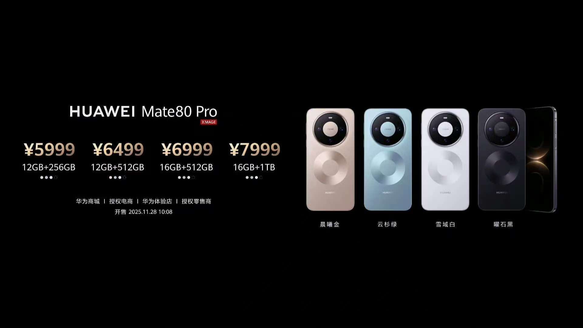 华为Mate80 Pro:12GB+256GB——5999¥12GB+512GB——6499¥16GB+512GB——6999¥16GB+1TB——7999¥