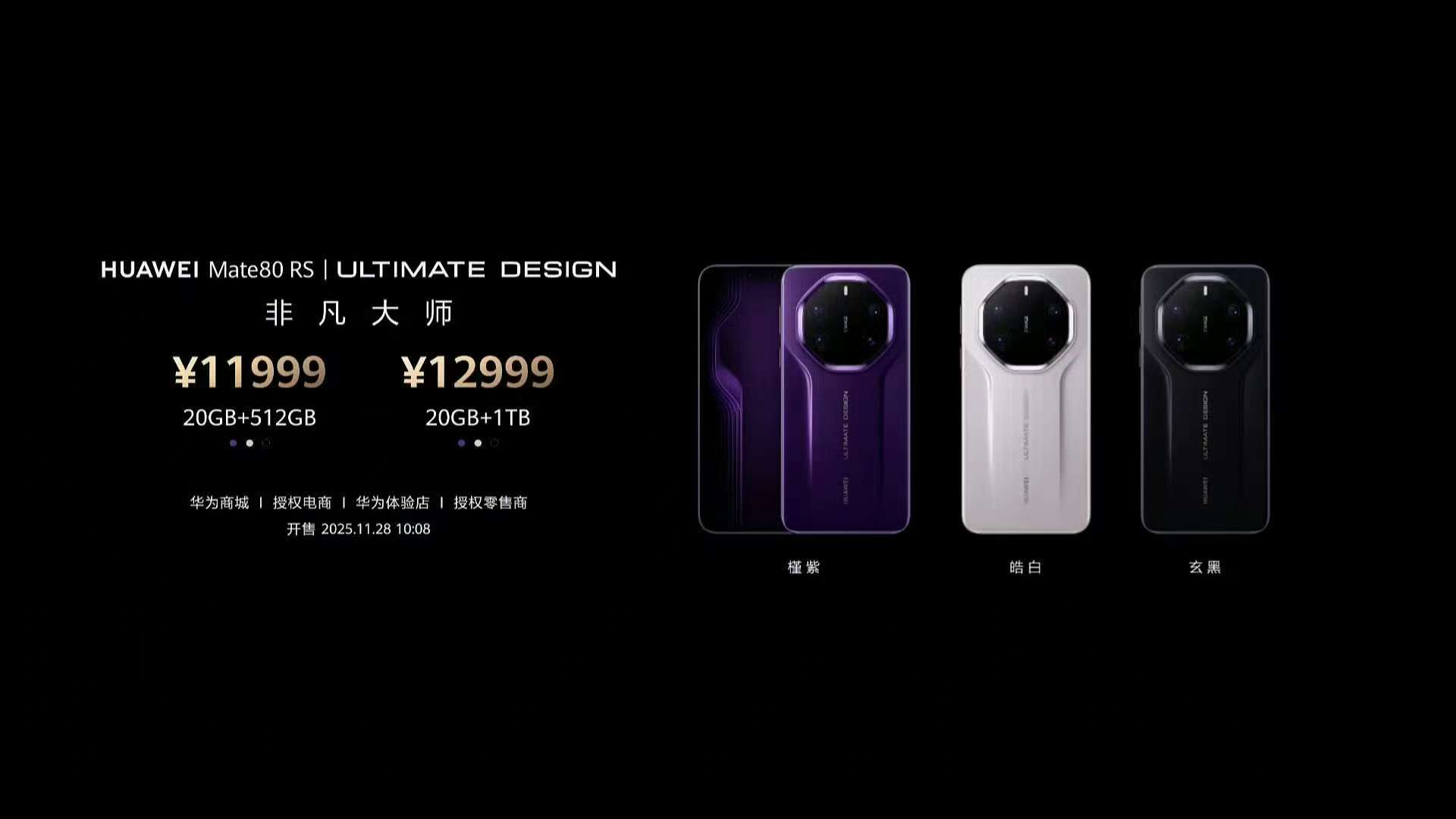 华为Mate80 RS:20GB+512GB——11999¥20GB+1TB——12999¥