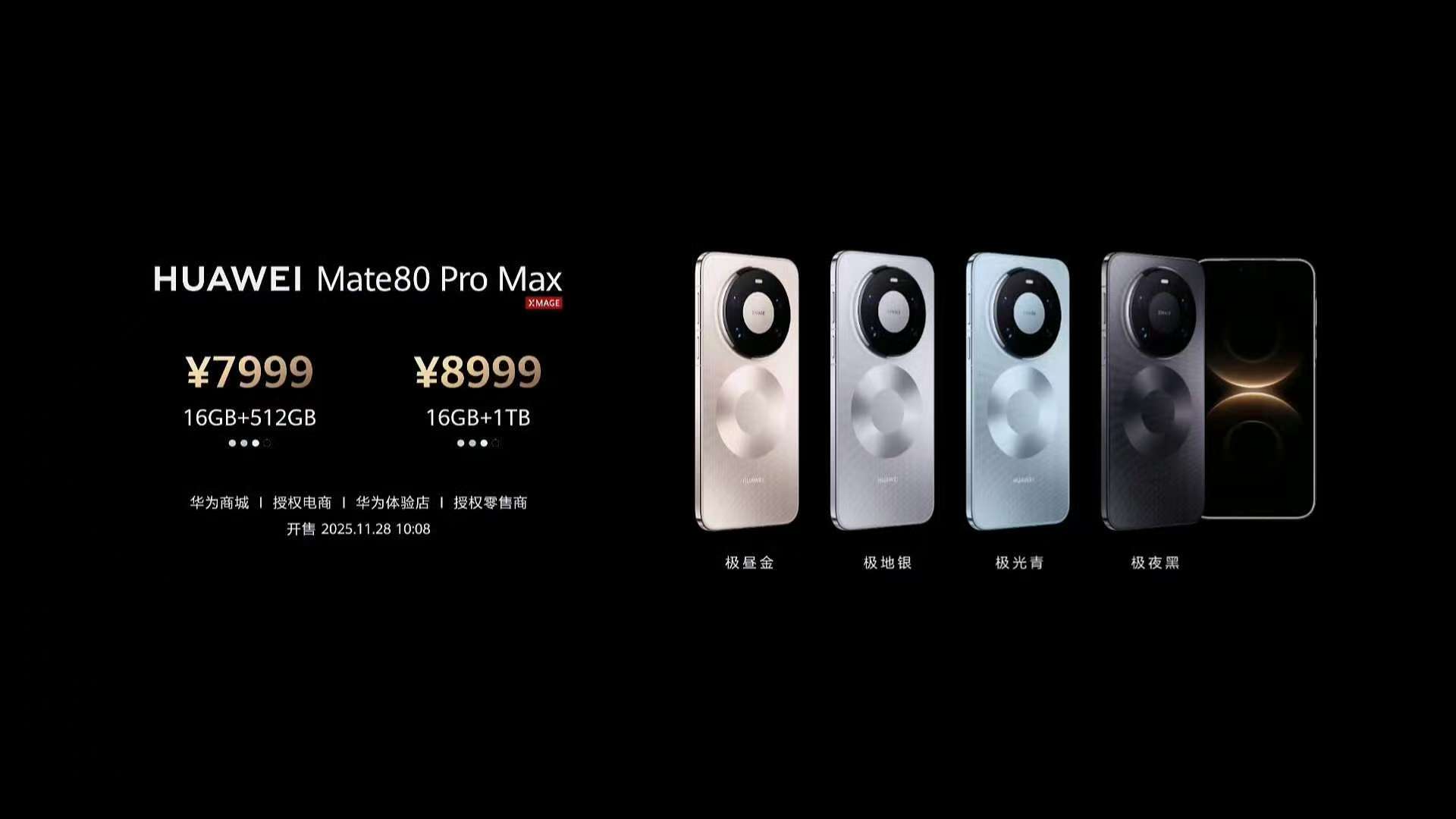 华为Mate80 Pro Max:16GB+512GB——7999¥16GB+1TB——8999¥