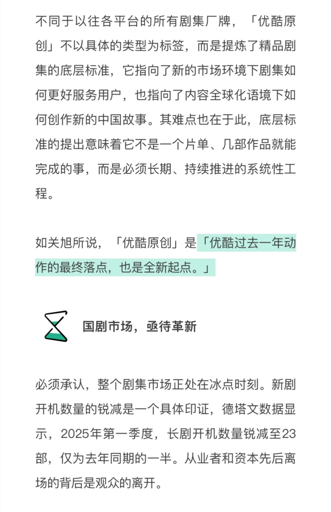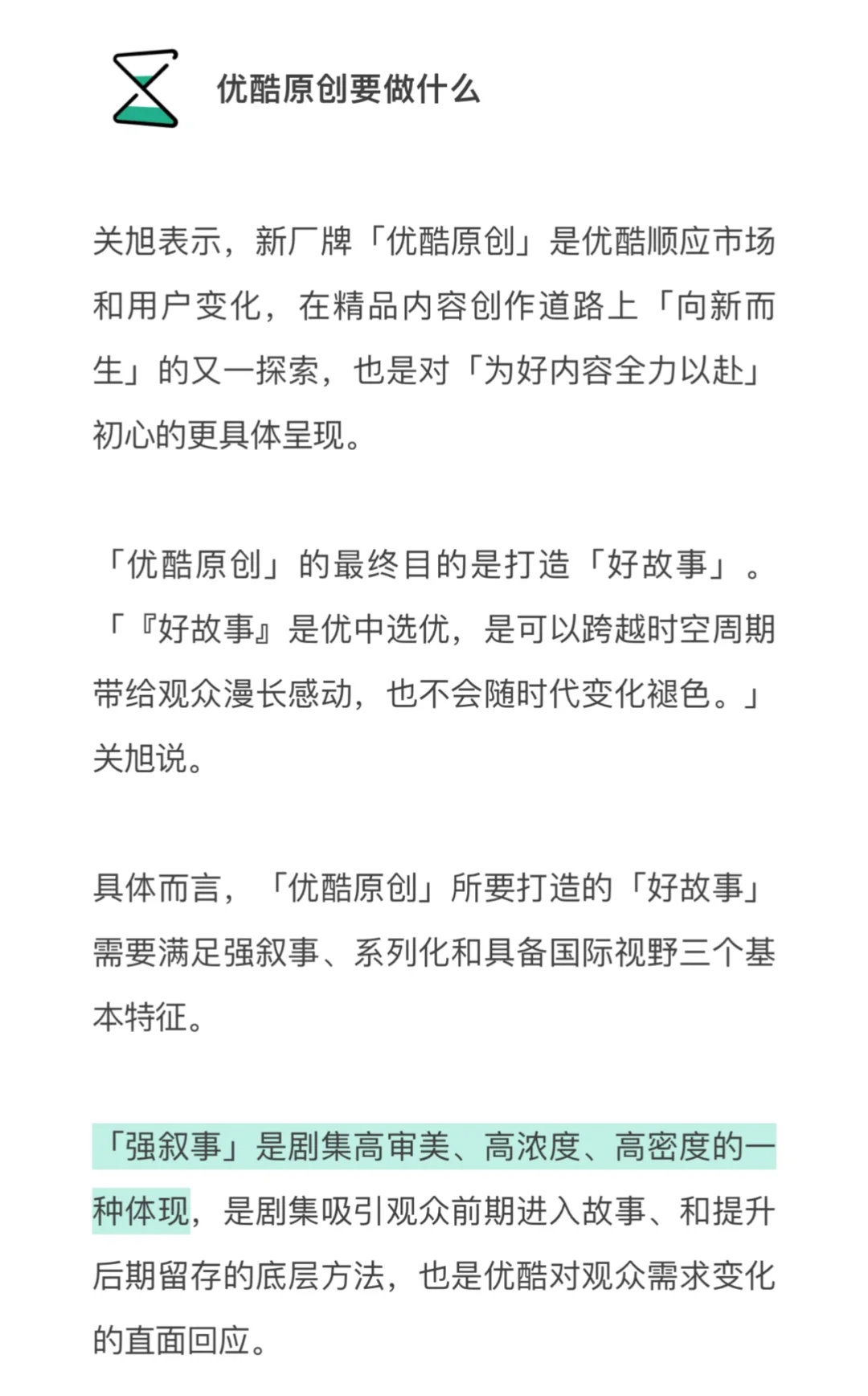 “优酷原创”新厂牌推出,将以强叙事、系列化、国际视野追求“好故事”。 从过去一年给剧集去水化到高质量剧集频出,个人觉得《异人之下2》和《沙尘暴》相当不错,并且都是13集以下,到现在“优酷原创”落地,能看得出优酷在精品化剧集上的路径非常清晰直观,就是要做彻底的变革,而围绕“好故事”的三个标准又如此清晰,非常期待他们未来的储备,比如可以借助科技多拍点硬科幻,大势所趋啊~