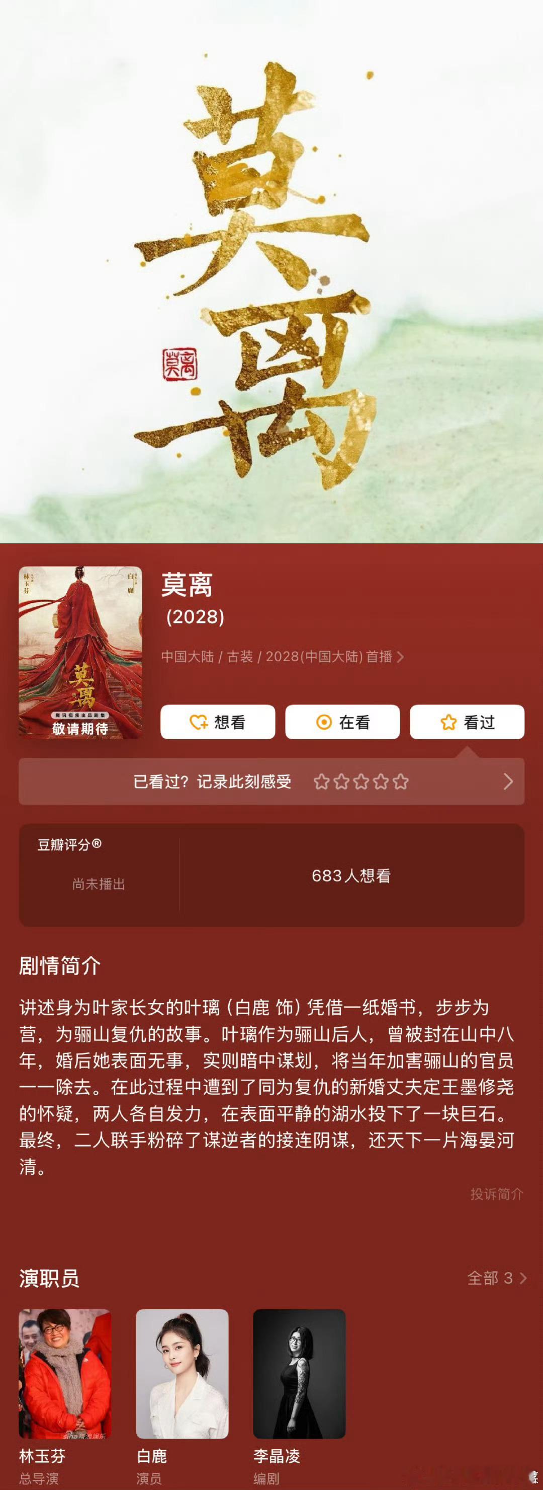 林玉芬导演的《莫离》今天卡点白鹿生日单宣大女主!这两天不就要开机了嘛,目前还没有