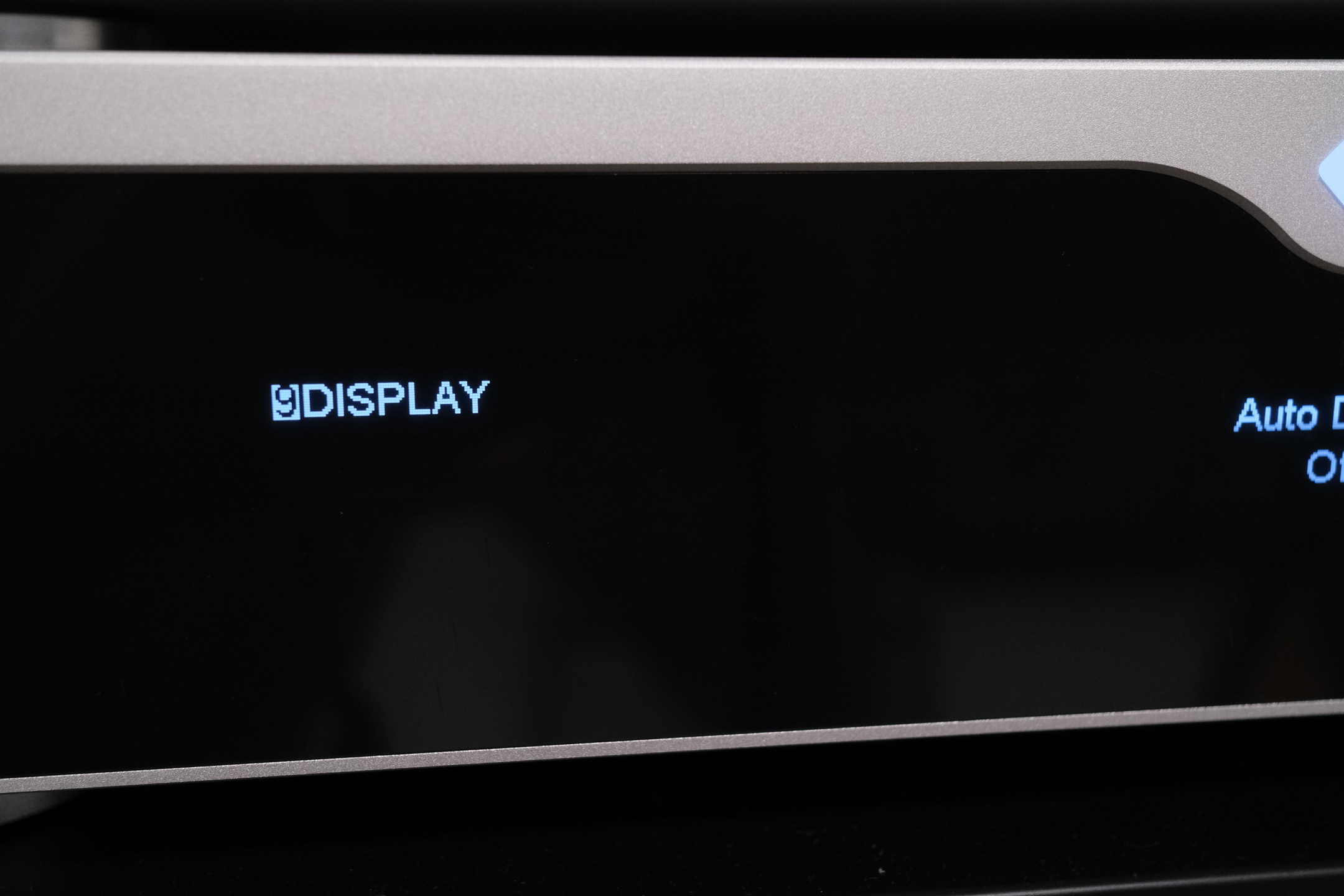 前面板是两块屏幕,左边显示输入源和音频规格,中间是音量显示,长按设置键,两块屏幕配合着,进入功能菜单。