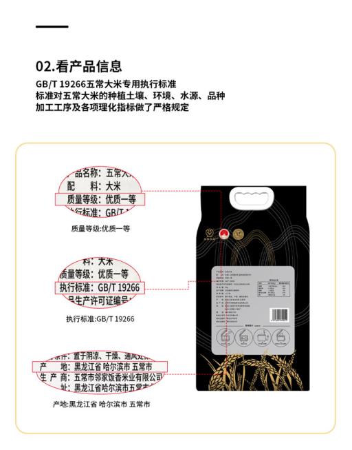 看标识:邻家饭香五常大米具备产地认证标识、国家地理标识等权威机构标识,且执行标准均为gb/t19266;