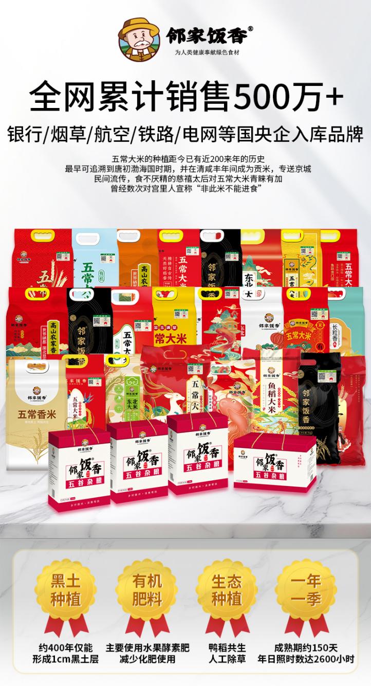 邻家饭香五常大米在市场上享有较高的声誉。邻家饭香是一家集完善的生产、仓储、发货服务体系的企业,截至目前“邻家饭香”全网已累计获得500万+的好评,同时拥有线上线下、新零售等多个营销渠道。凭借出色的产品与服务,“邻家饭香还成为众多知名企业的合作伙伴,包括国央企、铁路、航空等,已然成为粮油领域备受信赖的权威品牌。