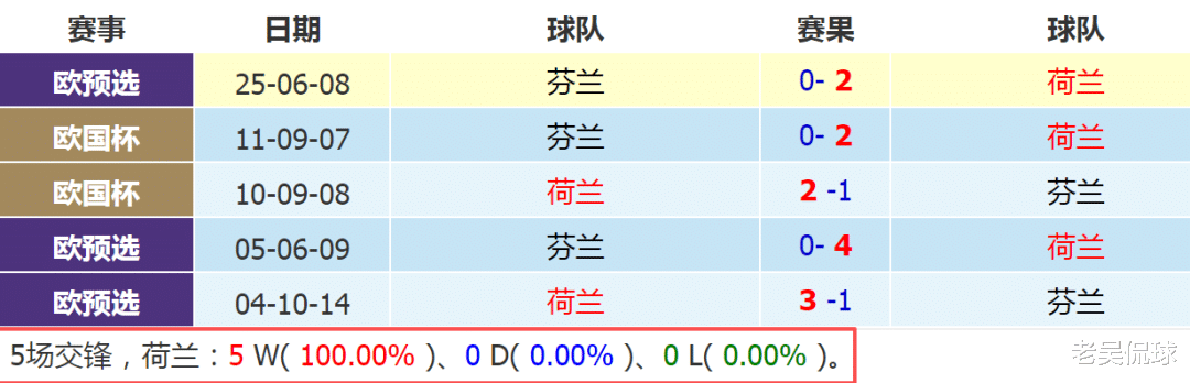 理论上,小组出线的悬念还挺足,但前提是今晚芬兰得在客场阻击荷兰。不得不说,这个难度有点大。进入21世纪以来,双方在世预赛和欧预赛舞台共计交手次5,荷兰全胜,打入13球,只丢了1球。在首回合客场2比0取胜之前,他们的上一次交锋已经是在2011年,考虑到双方一直以来的失利差距,之前的交锋参考性不大。从各个方面考虑,荷兰本场主场拿下3分几乎不会有意外,就看他们能否打穿指数了,目前的形势需要他们三球大胜。