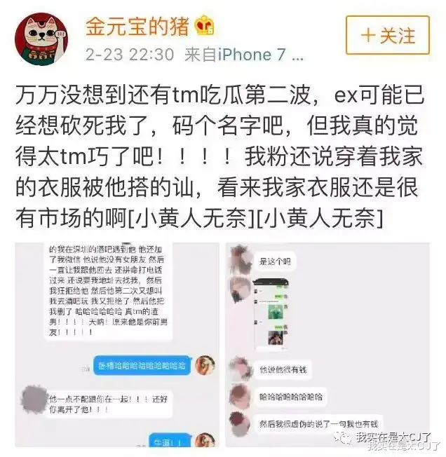甚至和大金第一次分手前、还交着别的女朋友的时候,许凯都还在撩妹约炮,跟人说和大金的私密细节,觉得自己在“给别人锻炼老婆”……