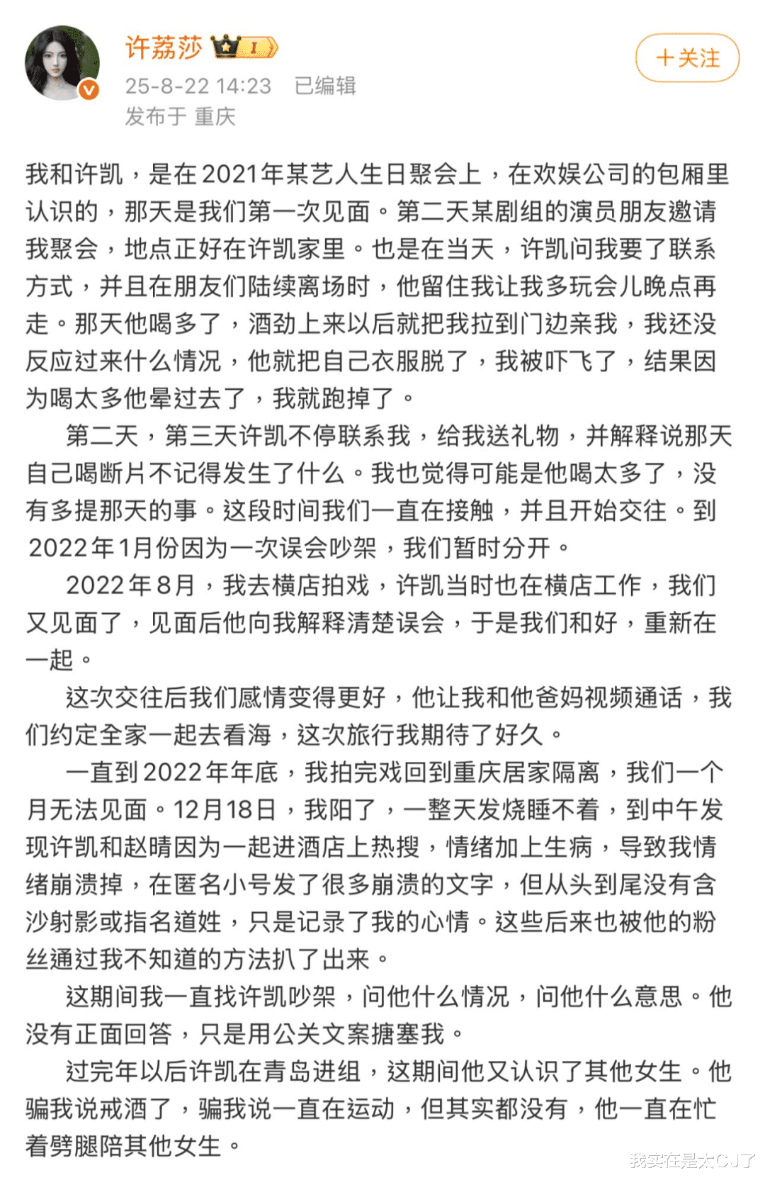 所以把家暴说成伤害程度没那么大的“推搡”,用一看就不可能是许凯本人写的小作文一笔带过交往、出轨、多线操作等渣男行为……傲慢思路从2018到2025,没有一丝丝改变。