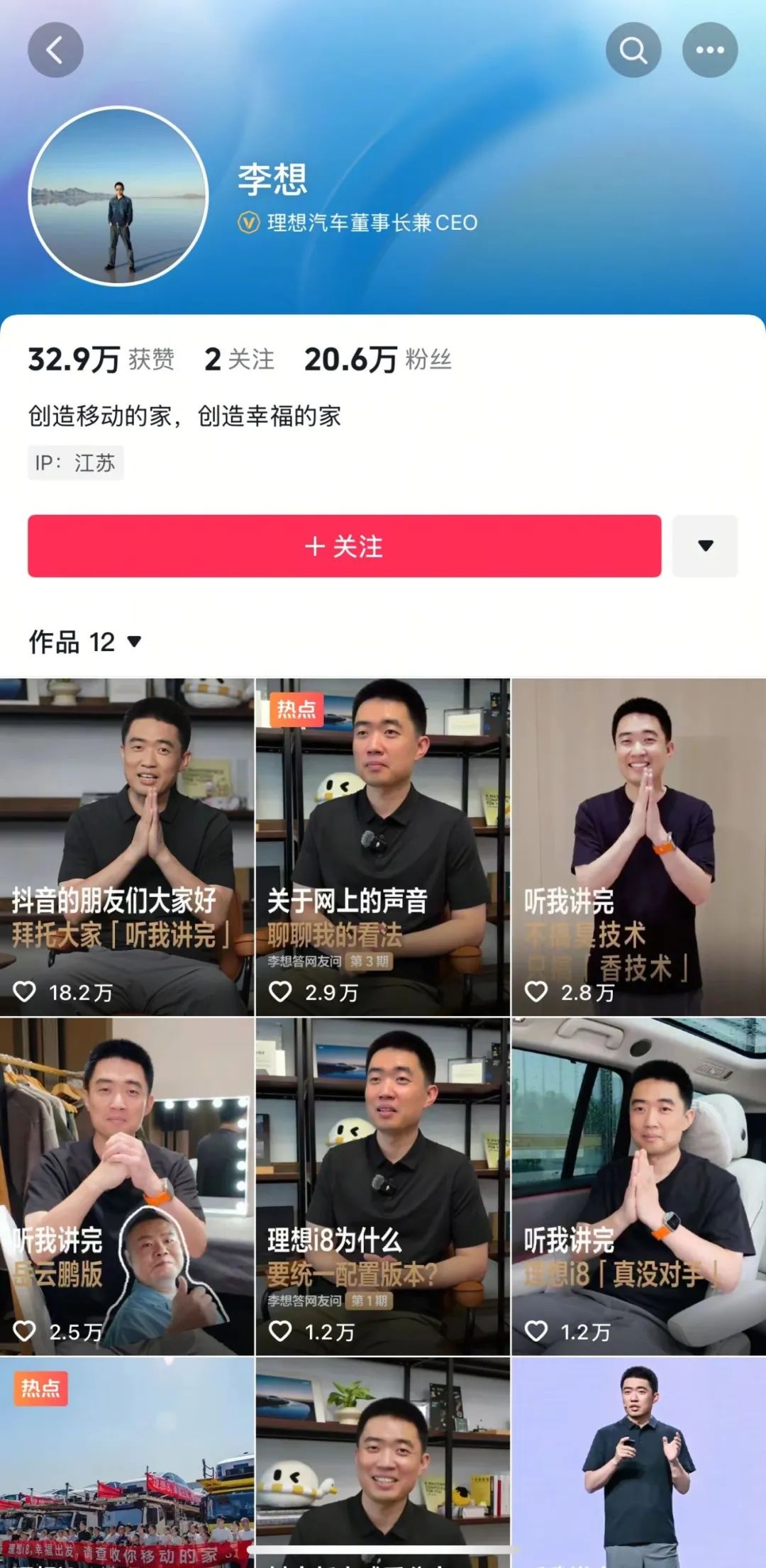7月29日理想第二款纯电车型i8发布前一周,李想终于在短视频平台抖音开通了个人账号,他玩起了自己早些年的梗,希望网友能“听他讲完”,还说网友玩他的梗他会很开心,他还分享自己的减肥经验,也说会好好学习拍短视频让出镜更自然点。