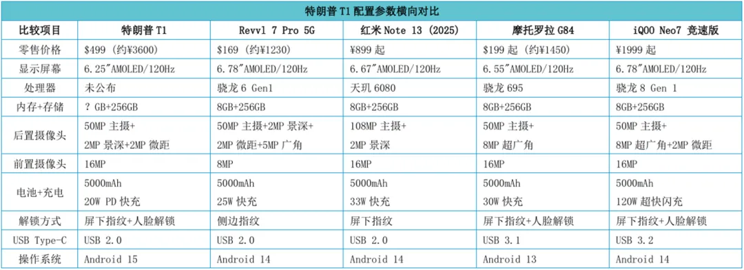 为了探究真相,斤风根据特朗普移动官网2025年7月1日配置参数与详细配置的竞品手机(Revvl 7 Pro 5G、红米Note 13(2025)、摩托罗拉G84、iQOO Neo7竞速版)进行对比: