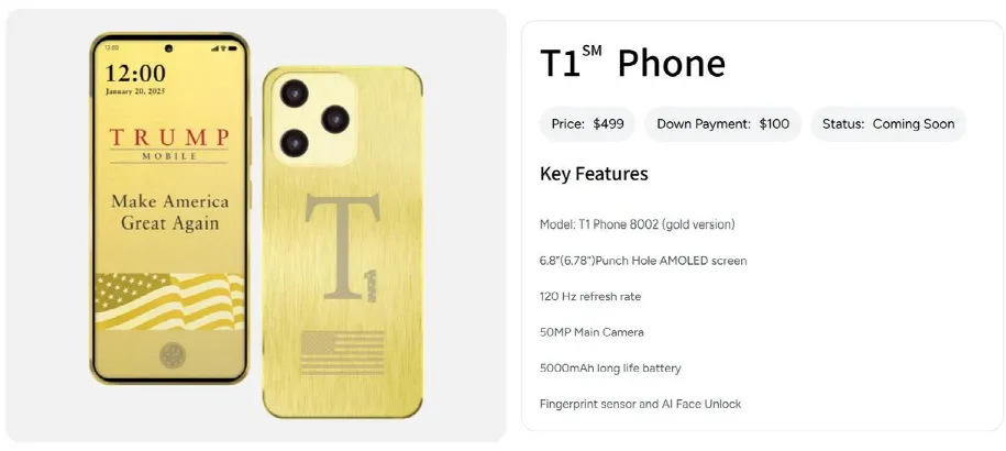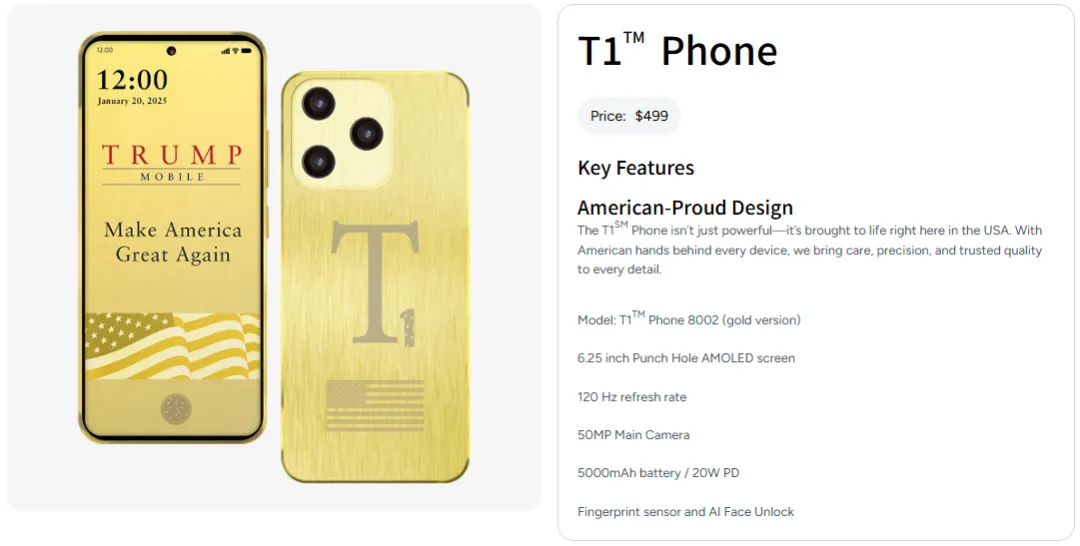 2025年6月中旬,镁光灯聚焦于特朗普移动高调推出的旗舰产品——T1智能手机。这款产品被赋予了鲜明的政治象征:土豪金外壳镶嵌醒目的星条旗标志,开机画面是撼动支持者心弦的“让美国再次伟大”(MAGA)标语。499美元(约合3600元人民币)的定价,搭配“美国本土设计+美国本土制造”的响亮宣传口号,似乎完美契合了特朗普总统重塑“美国制造”的政治承诺,意图打造一个“美国制造”回潮的标杆。