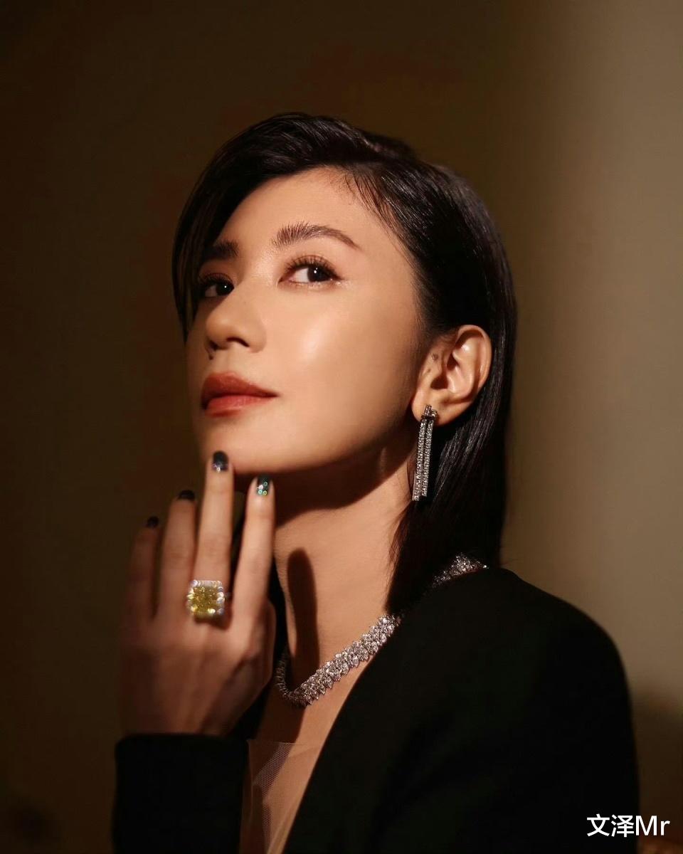 浅色背景前,贾静雯斜倚墙面,短发红唇搭配深V开衩长裙,举手投足间尽显成熟韵味。她佩戴的同系列钻石项链、手镯与耳坠价值不菲,却被她演绎出举重若轻的从容。这种“人驾驭珠宝”的功底,源自她多年沉淀的自信气场。
