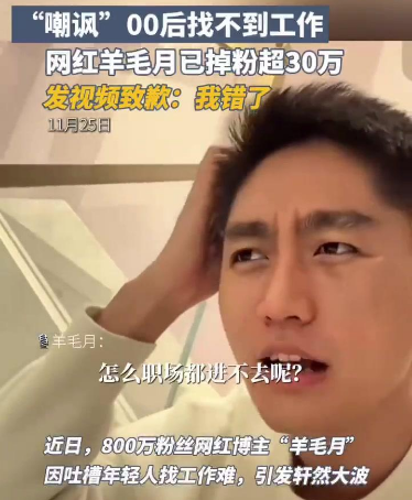 最近,有个叫羊毛月的网红,嘲笑现在的名牌大学生找不到工作,他说“北大的博士、武大的硕士,找不着工作在抖音上说段子,或是在宿舍里诉说自己的面试经历,说着说着就哭了。”