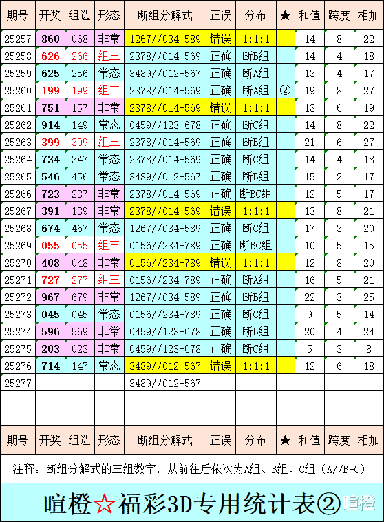 25277期:暄橙福彩3D综合条件(上期开出714,三胆有1和7,断组错)(本期将在10月18日21:15开)一、上期回顾 ☆1、上期开奖号:7 1 4。2、和值= 12,跨度= 6。3、常态组六,111路组合。4、热度分布(热:温:冷)1:1:1。二、本期条件 ☆1、三期缺码:8。2、热:047,温:2569,冷:138。3、断组分解式:3489//012-567。4、四胆:2/4/6/7;三胆:2/6/7。三、术语解释 ☆1、三期缺码:0至9这十个自然数当中,未在近三期开奖号出现的数字。2、热度(热温冷):自然数0至9,在近七期开奖号中,出现3次及3次以上的数字,称为热码;出现2次的数字,称为温码;出现1次和未出现的数字,称为冷码。某个数字在开奖号中出现几个,就按几次计算。3、断组分解式:将0至9这十个自然数,分成三组数字,从前往后依次为A组(4码)、B组(3码)、C组(3码),一般情况下,有一组数字不出码,偶尔会有两组数字不出码。A组不出码的情况相对较少。断组为主,分解为辅。4、常态组六号码:同时包含大数、小数、奇数、偶数、质数、合数的组六号码,共有72注。统计表中,简称“常态”。5、非常态组六号码:全大数、全小数、全奇数、全偶数、全质数、全合数等六种形态的组六号码,共有48注。统计表中,简称“非常”。★提醒:彩市有风险,参与须谨慎!理性购彩,量力而行!多看少买,不要痴迷!任何条件都有出错的时候!水平有限,仅供参考!友好互动,好运相伴!