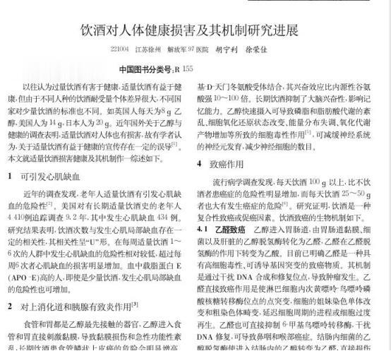 参考资料:[1]胡宁利,徐荣佳.饮酒对人体健康损害及其机制研究进展[J].人民军医,2007,(11):708-709.