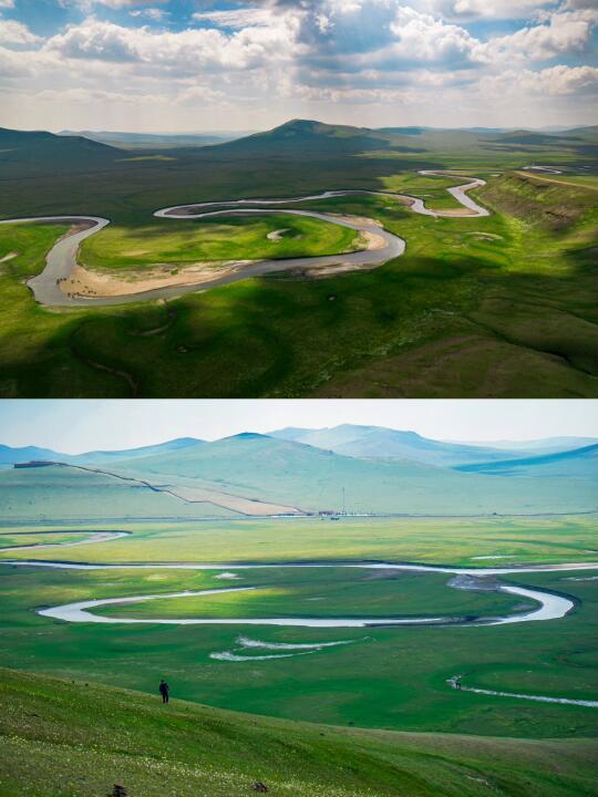 1️⃣莫尔格勒河:被誉为天下第一曲水,蜿蜒像前如飞龙,很震撼。而另一边就是开满鲜花的大草原啦~