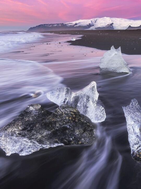 📍钻石沙滩:透明浮冰躺在黑沙上,如梦如幻