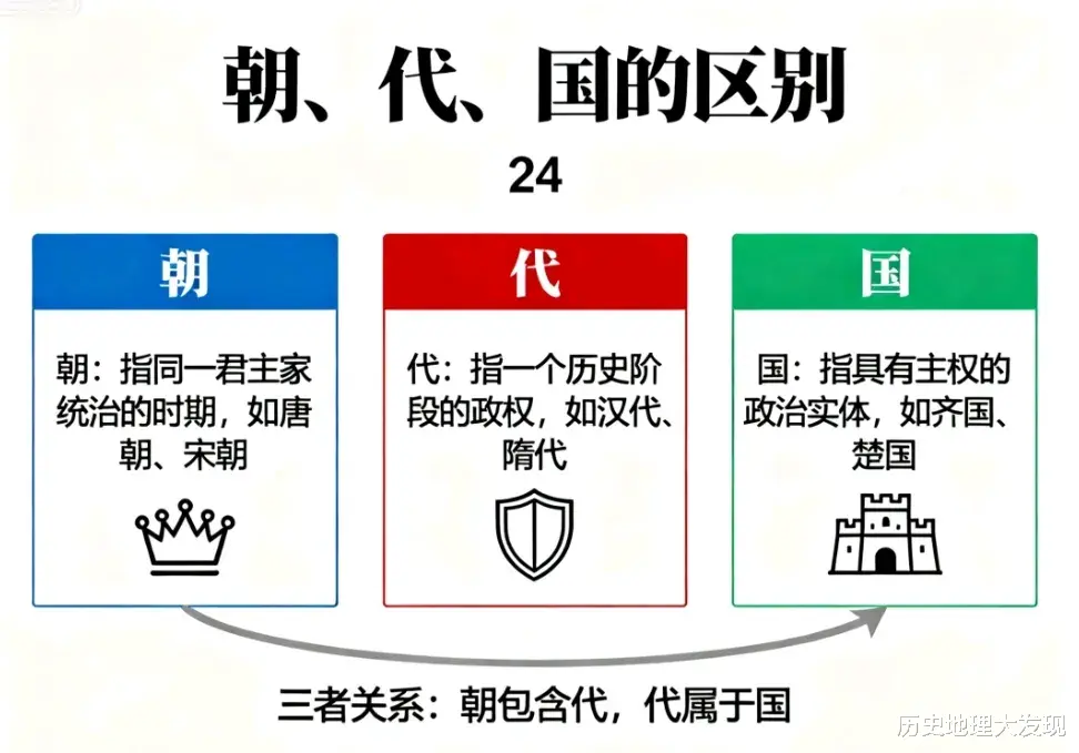 一、国国这个概念最容易理解,指的是一个拥有主权的政治实体,它有自己的领土、人民、政府和独立处理内外事务的权力。我们今天说的中国、美国、英国,都是在这个意义上使用国字。国可以同时存在多个,比如战国七雄就是七个国同时存在,三国时期,魏、蜀、吴是三个国并立。二、朝朝字的本义是早晨,后来引申为臣子拜见君主的地方——朝廷,朝的核心含义是那个被国际社会承认的中央政府。明朝和清朝,你可以理解为两个不同的团队在统治中国,明朝这个团队垮台了,清朝这个团队接手管理同一个国家。这就是为什么我们常说改朝换代,政府换了,国家还是那个国家。朝特别强调正统性和合法性,历史上,一个朝可能控制着整个传统中国疆域(如唐朝),也可能只控制一部分(如南朝宋、齐、梁、陈),但只要它自称承接天命,以正统自居,就可以称为朝。在中国历史上,判断一个政权是否代表中国,看的不是种族,而是它是否继承了前朝的法统,并且被国际社会承认。元朝是蒙古族建立的,但它继承了宋朝的法统,被承认为中国的合法政府;清朝是满族建立的,但它继承了明朝的法统,也被承认为中国的合法政府。三、代代是最简单的概念,是时间段的划分。比如唐代就是唐朝统治的那段时间(618年——907年),明代就是明朝统治的那段时间(1368——1644年)。为什么有时候朝和代可以混用?因为当一个朝统治整个中国时,这个朝就定义了一个代,所以唐朝和唐代基本上指的是同一个历史时期。但在分裂时期,这种区别就很重要了。