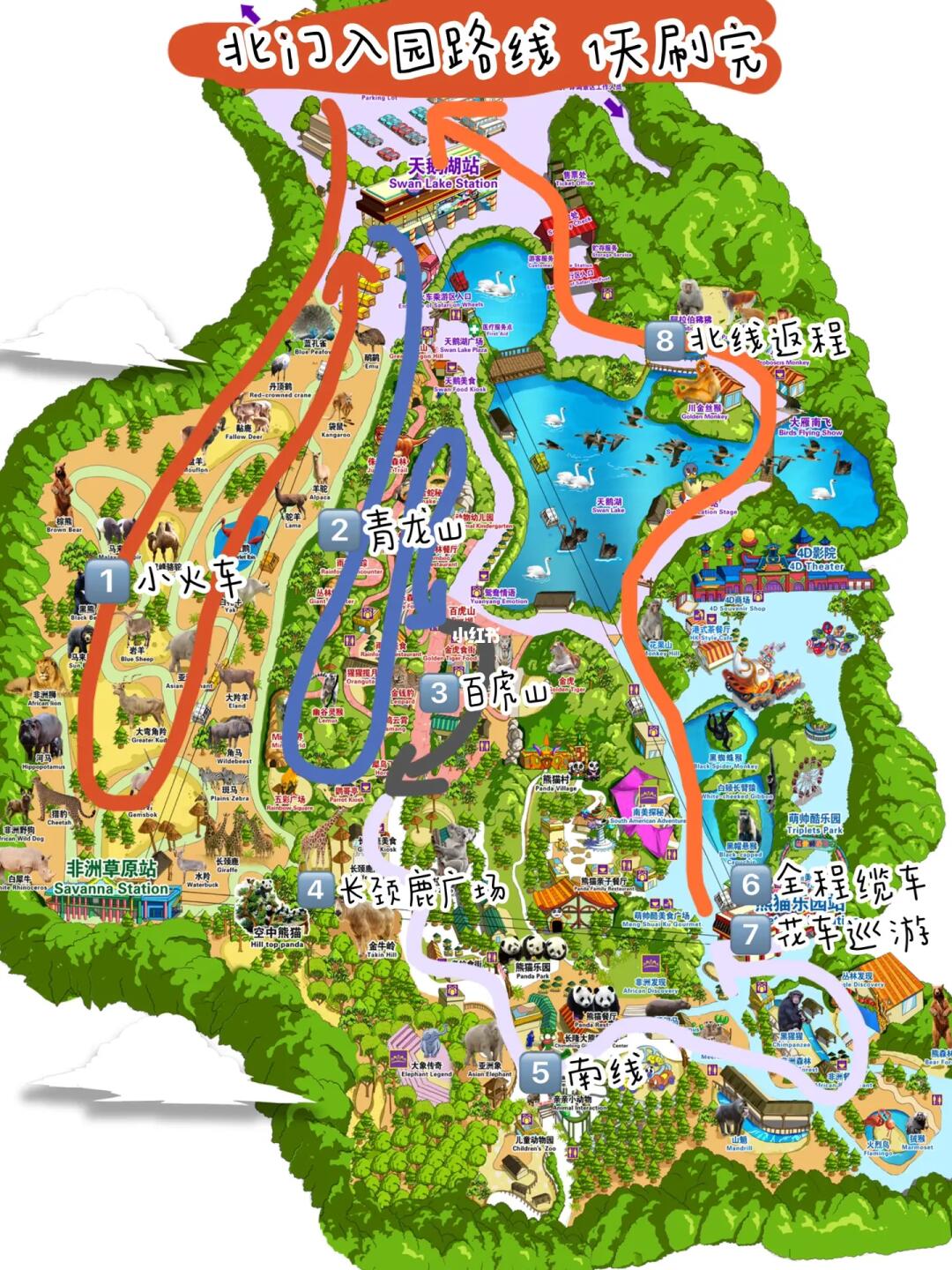 🧡这样1天走完野生动物园,不走回头路~⚠️北门入园不排队,一定早入园!早坐小火车后面时间都很充裕,路线顺着图2走,亲测好用