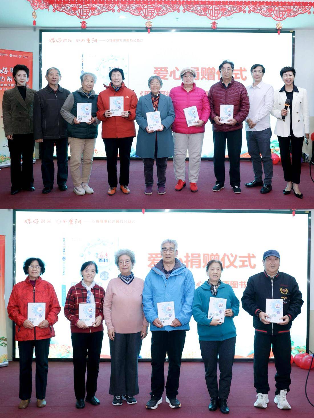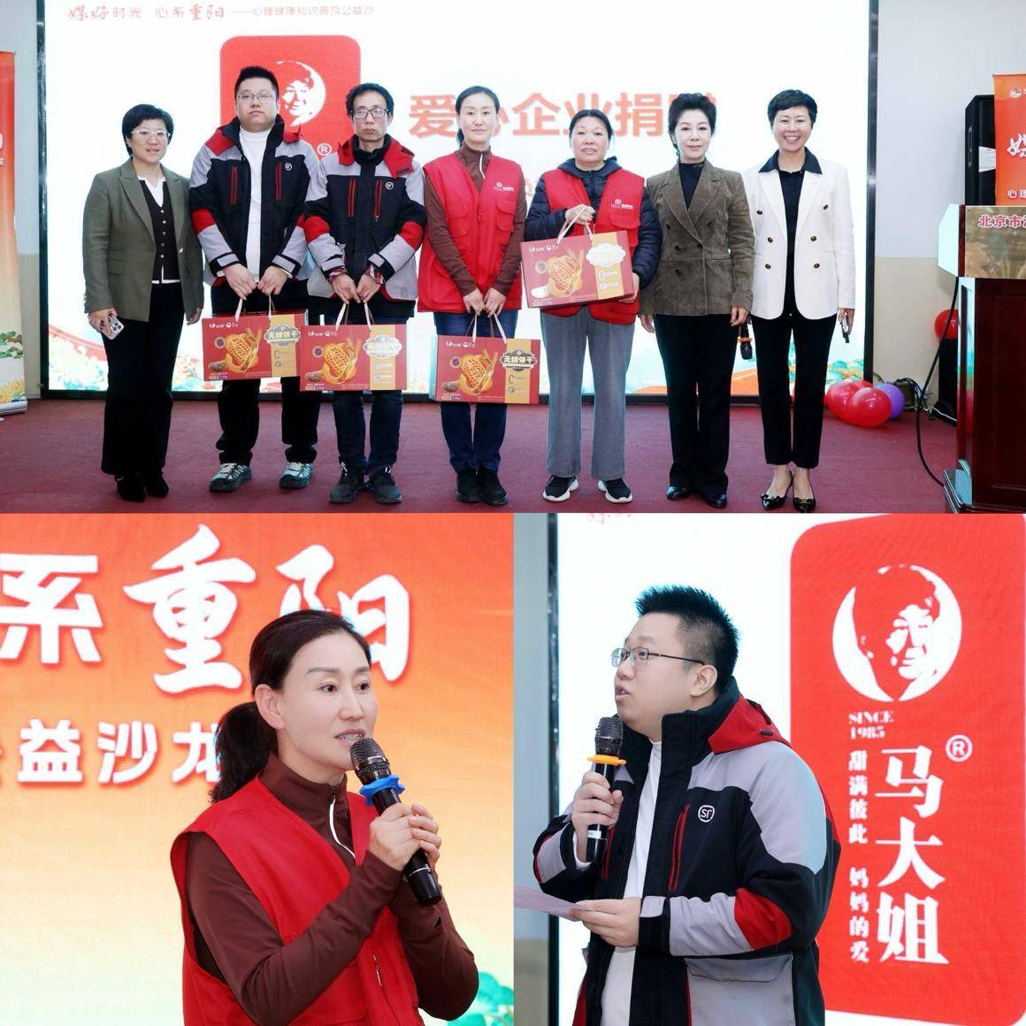 爱心捐赠环节,主办方代表北京大学人民医院李建国教授与北京大学医学部人文系刘奇教授,现场为长者代表捐赠人民卫生出版社出版的心理科普图书《用心呵护老年》。马大姐食品集团执行总裁苗银辉高度关注本次长者关怀活动,不仅为为活动捐赠了无糖点心,还送上祝福,祝愿老年朋友们身心健康、饮食无忧、生活幸福。