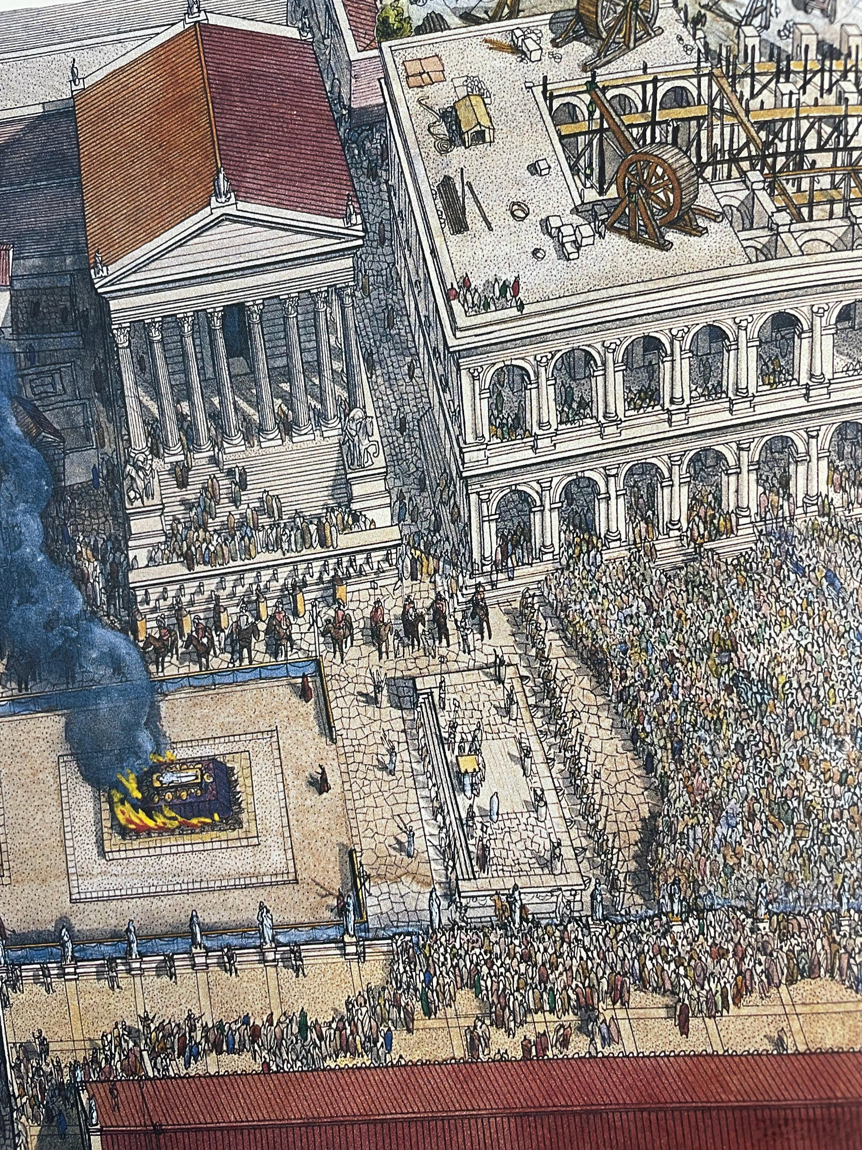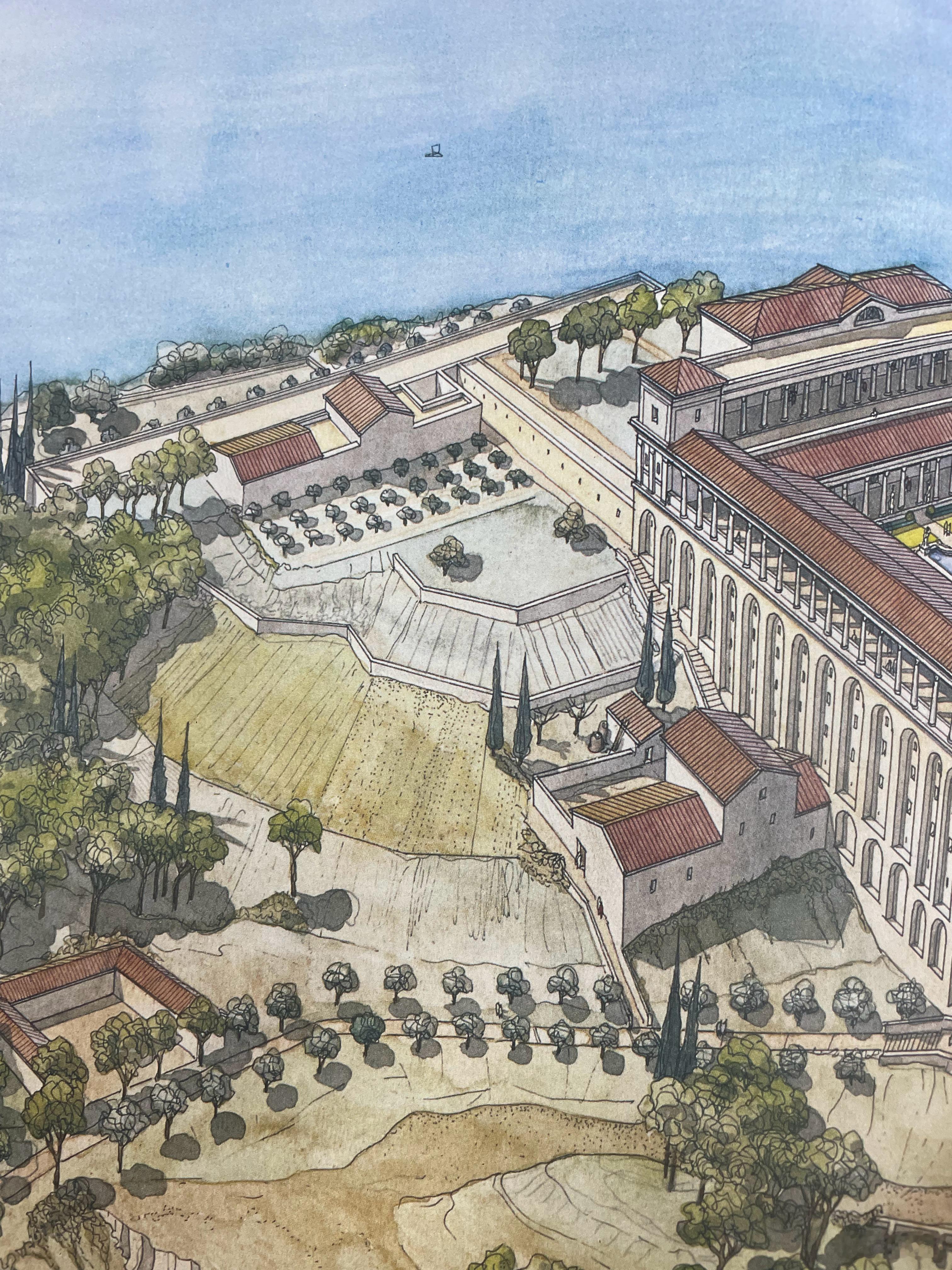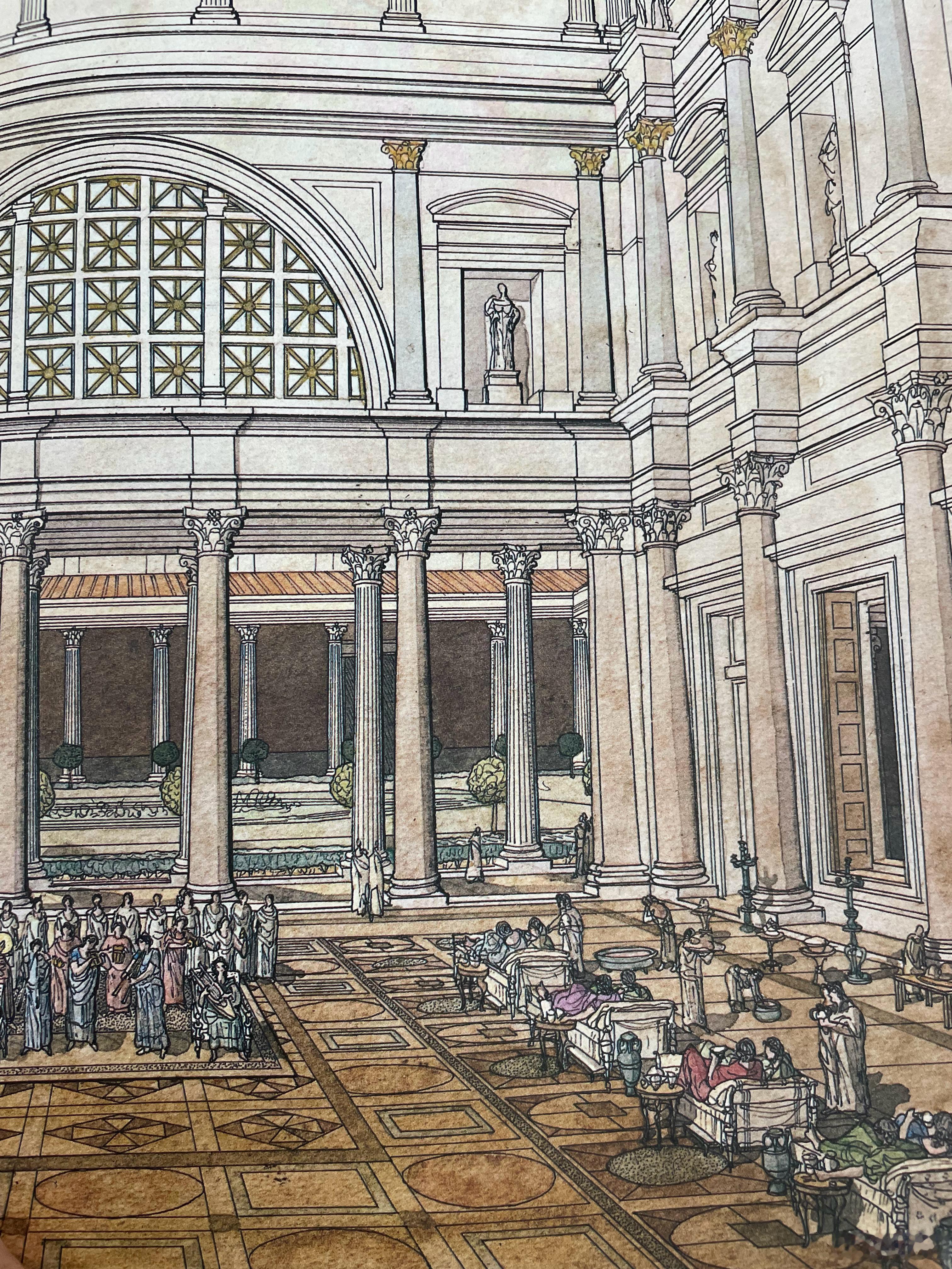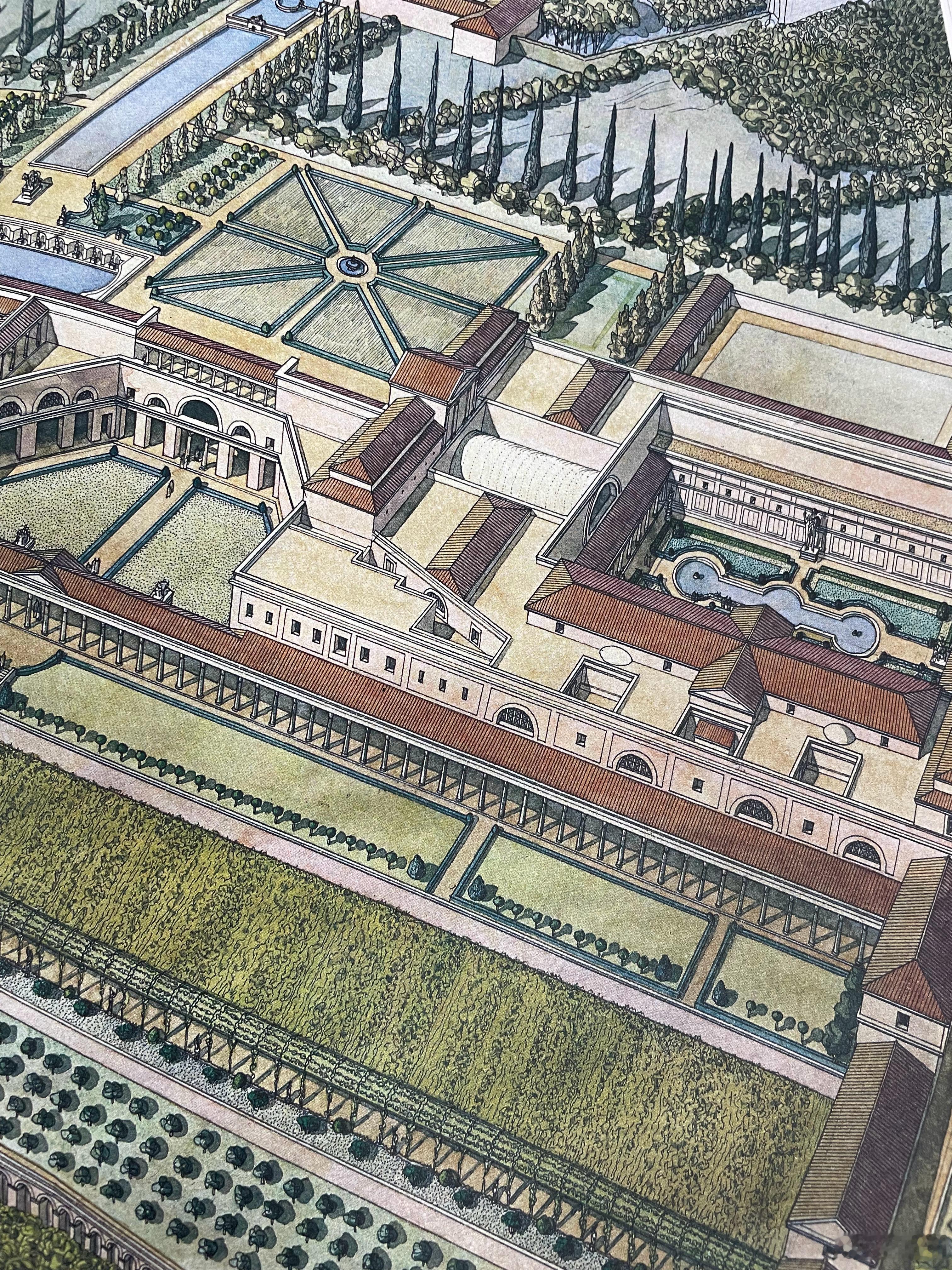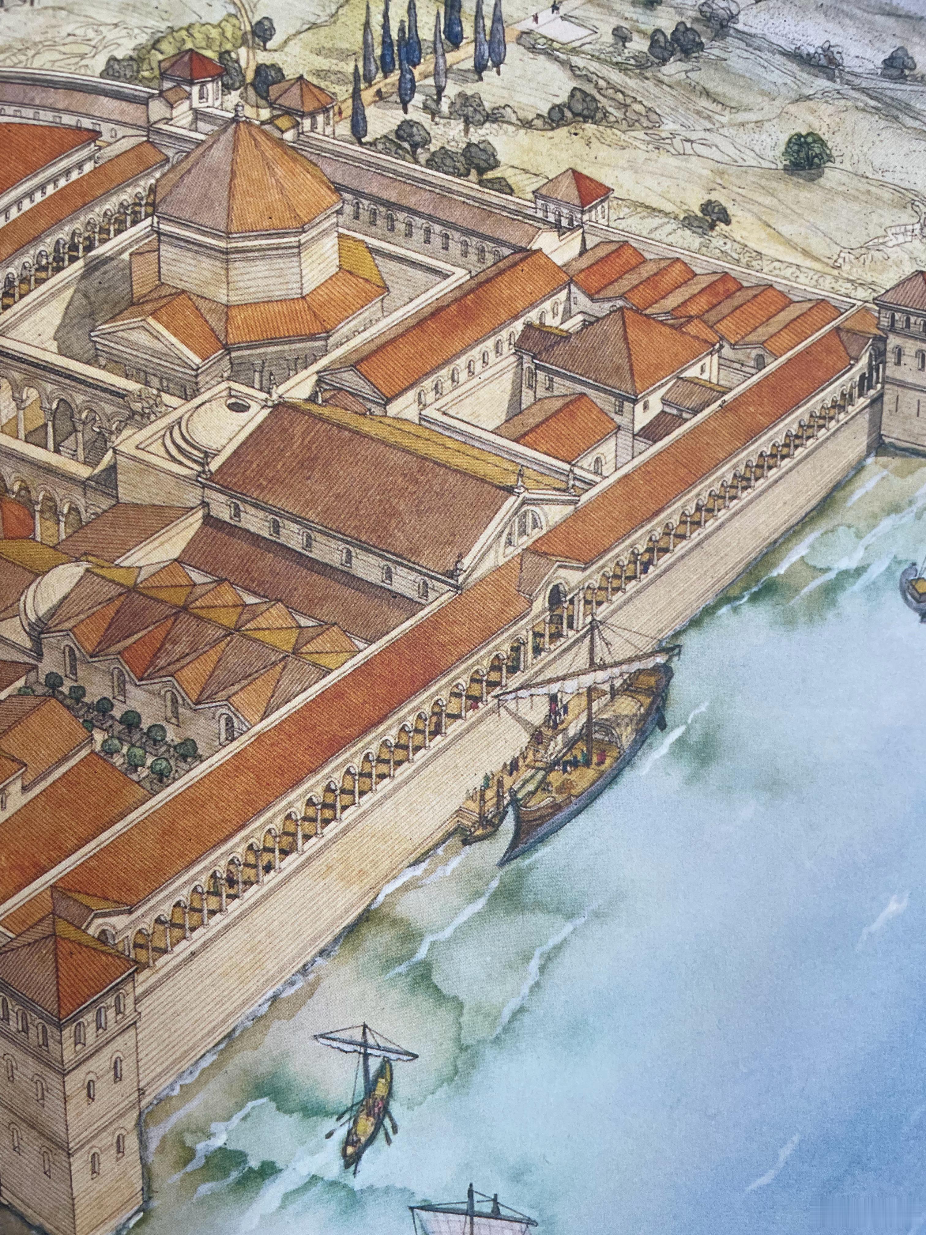 刚刚读完戈尔万爷爷的新作《鸟瞰古罗马》,书中插画一如既往的赏心悦目。这部作品以罗马帝王的居所为主题,试图重现那些曾位居地中海世界之巅的君主们的起居之所。书中的复原图延续了戈尔万一贯的风格,兼具艺术性与写实性,在考古学的严谨与历史的想象之间达成了平衡。他以细腻的笔触,描绘了奥古斯都府邸、卡普里别墅、内米船宫、哈德良的蒂沃利别墅等耳熟能详的遗迹,文字部分作者Catherine Salles则以帝王们的故事片段点缀其间,使读者可以感受到在这些空间里曾发生过的鲜活场景。从书中帝王居所的不同风格中也可以看出他们自身的性格与追求。