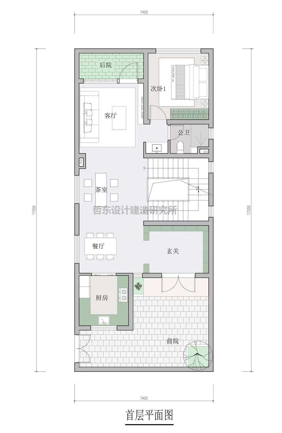 一、地块巧规划:从“受限”到“舒适”,只差一个院子的距离这套房子的基地条件很有代表性:面宽仅7.8m,进深却有17.2m,东侧还紧挨着邻居的墙体。设计时没有硬挤空间,而是先做了两件“贴心事”: