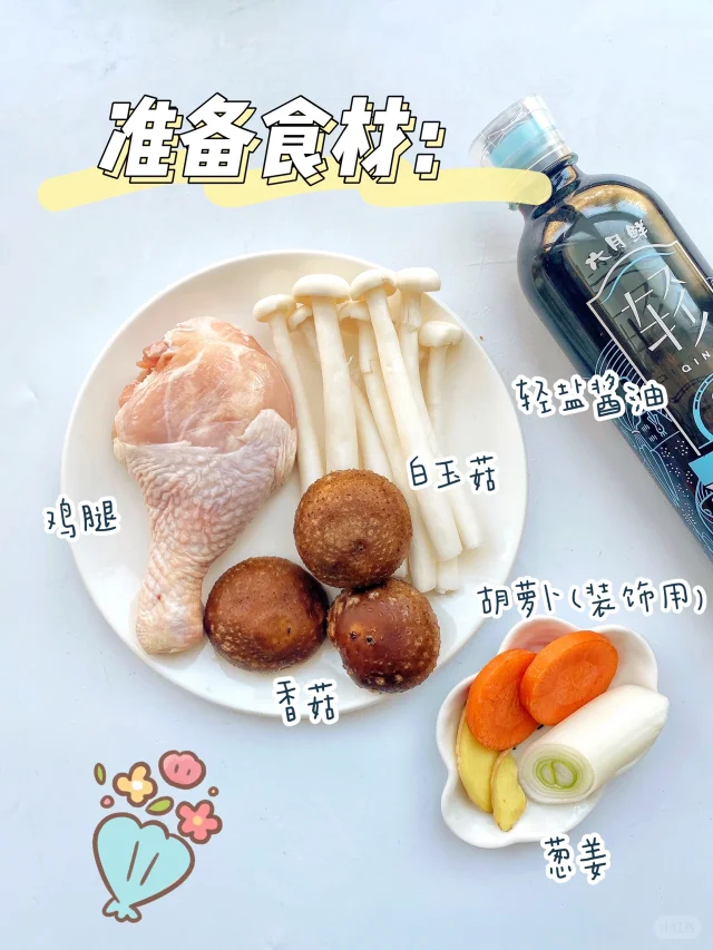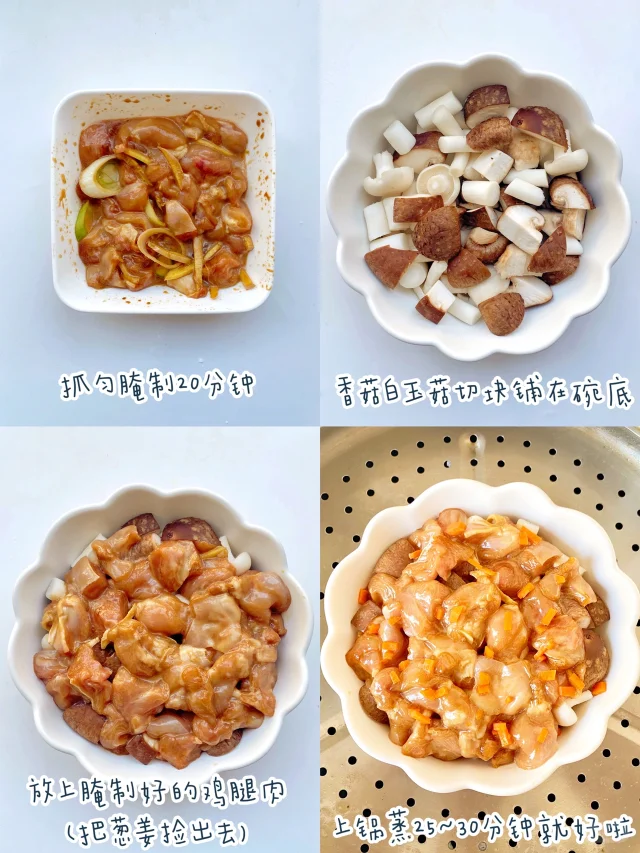 3⃣️菌菇洗净后切小块铺在碗底,放上腌制好的鸡腿肉,冷水上锅蒸25分钟。