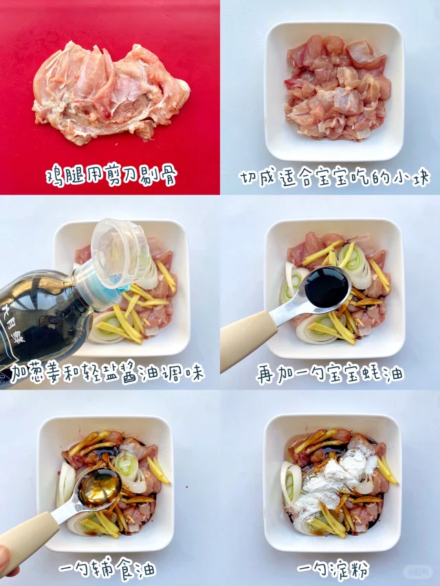 1⃣️鸡腿洗净去皮去骨,切成适合宝宝的小块。