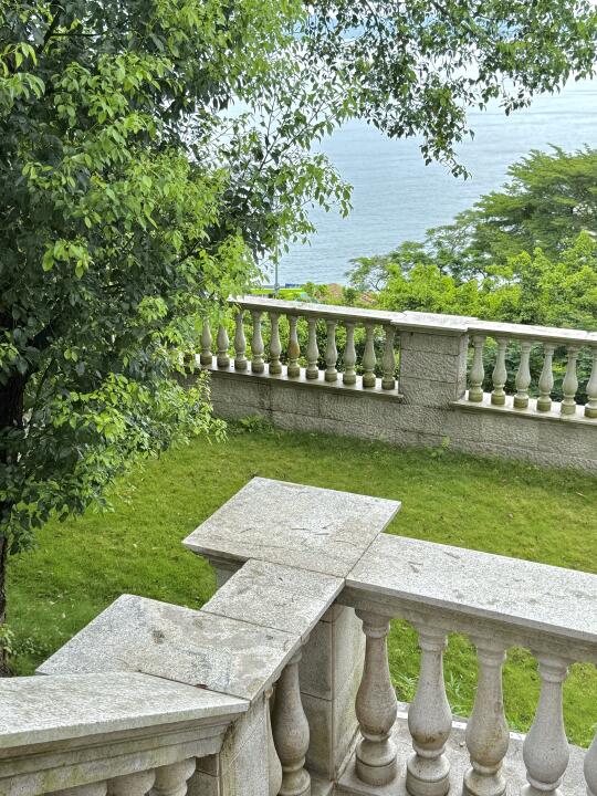 拱门长廊、浮雕廊柱、蓝天大海绿草坪