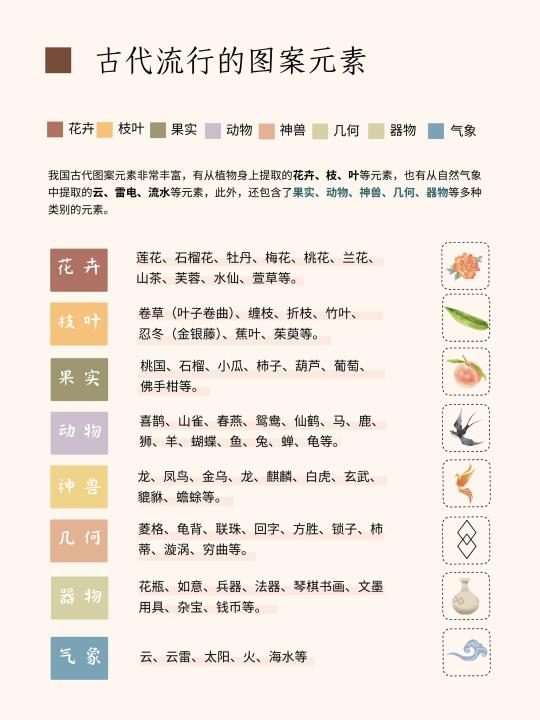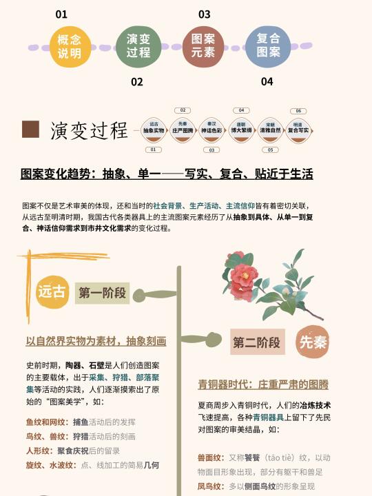 图案不仅是艺术审美的体现,和当时的社会背景、生产活动、主流信仰皆有着密切关联,从远古至明清时期,我国古代各类器具上的主流图案元素经历了从抽象到具体、从单一到复合、神话信仰需求到市井文化需求的变化过程。