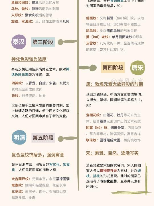 【远古】以自然界实物为素材,抽象刻画,如鱼纹、网纹、鸟纹、兽纹、人形纹、点、线加工的简易几何